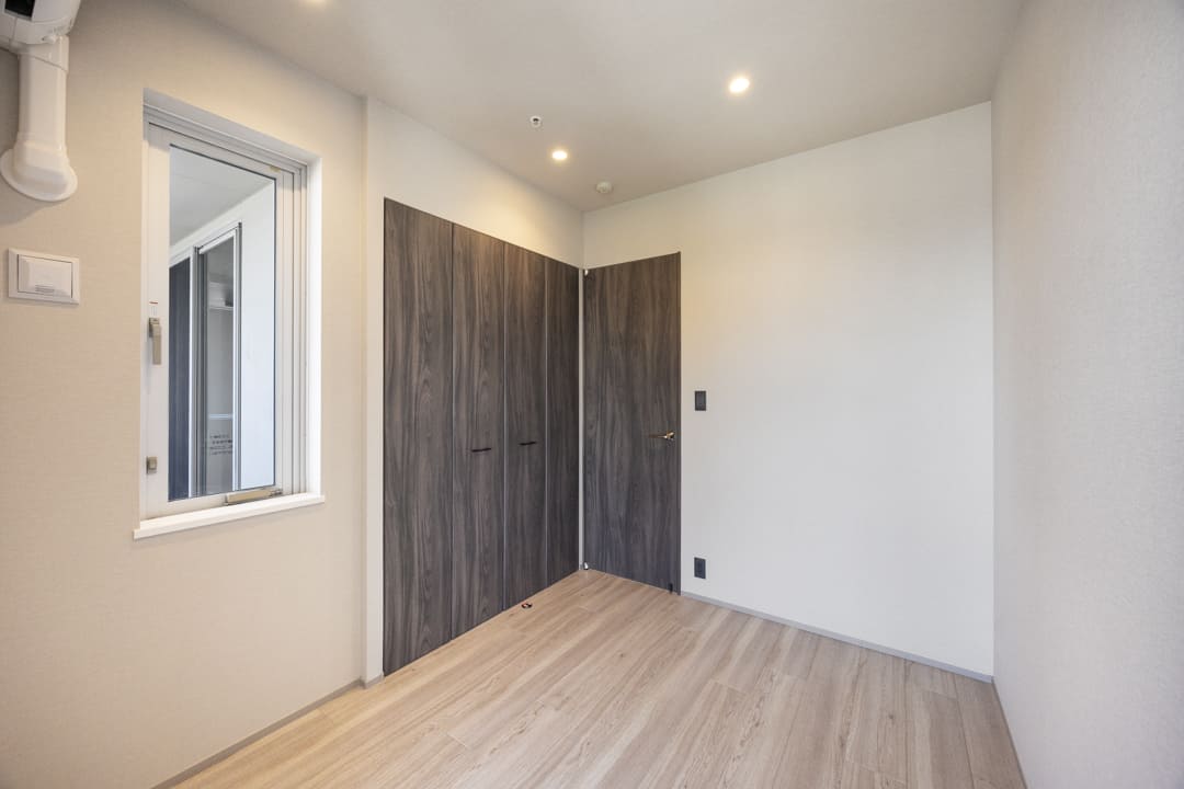 約5.8帖の寝室1。北西向きのバルコニーに面し、窓の外へと視線が抜ける開放的な空間です。4枚折れ戸のクローゼットを備え、収納スペースもしっかり確保。子ども部屋としてはもちろん、プライベートルームとしても使いやすい一室です。
