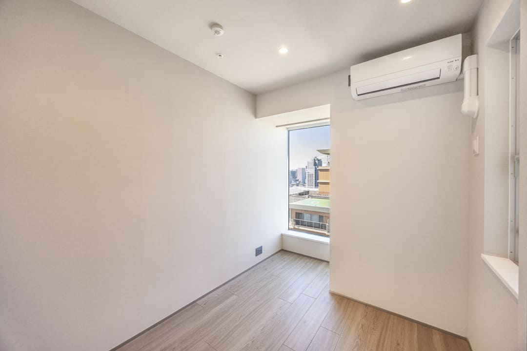 廊下の突き当たりに位置する約5.2帖の寝室2。2面採光により、明るい自然光が差し込む明るく開放的な一室です。窓の先には空の広がりを感じられ、開放感も魅力。ほどよいこもり感があり、ワークスペースや趣味部屋としても活用できそうです。