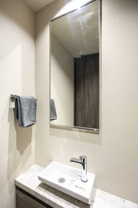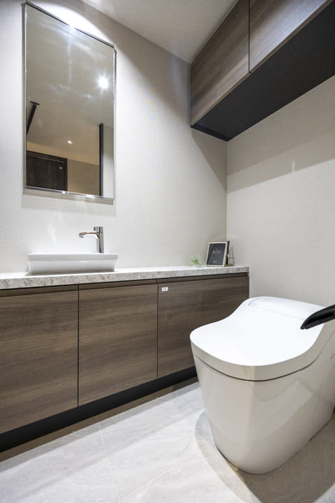 廊下に面していて独立性の高いレストルーム。Panasonic製の洗浄機能付トイレに新規交換済みです。タンクレス仕様でスタイリッシュですね。ミラー付きの手洗いカウンターを備え、来客時にもスマートにお使いいただける設計。身だしなみを整えるひとときにも配慮された、ホテルライクな空間です。吊戸棚にはトイレットペーパーや掃除用品を収納でき、生活感を抑えることができます。