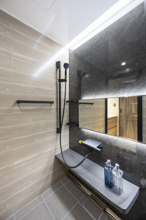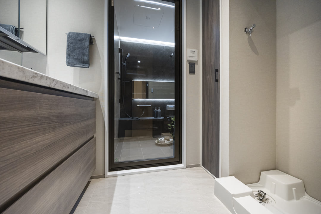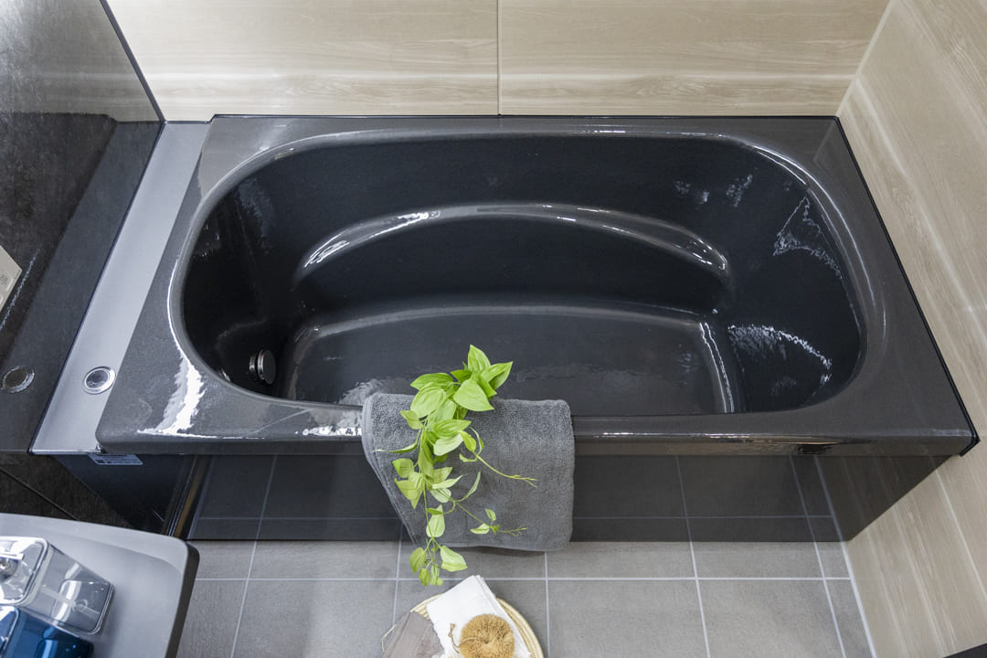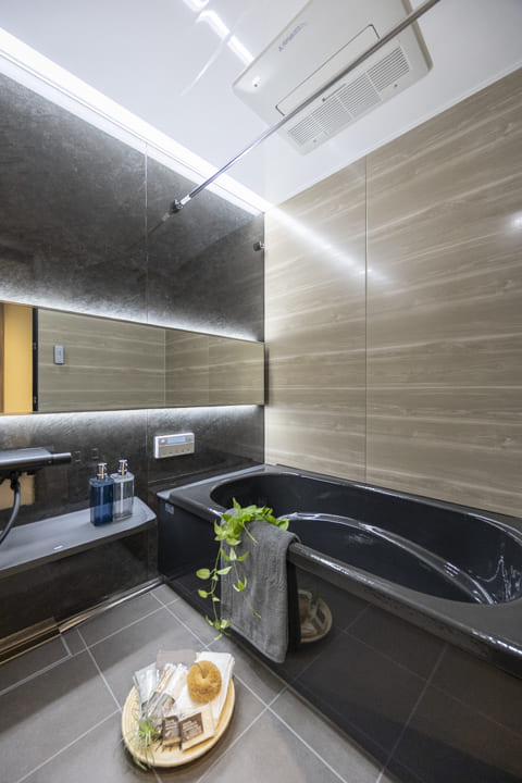 ブラックの浴槽が印象的な、重厚感の漂うバスルーム。ワイドミラーが奥行きをもたらし、空間に広がりを感じさせます。浴室には、タカラスタンダードの「プレデンシア」シリーズを採用。鋳物ホーロー浴槽ならではのなめらかな質感と高い保温性も魅力です。浴室換気乾燥暖房機・追い焚き機能を備え、季節を問わず快適なバスタイムをお過ごしいただけます。さらに、昼白色から電球色へ光の色を切り替えたり、明るさをスムーズに調整できる調光・調色機能を搭載。朝の爽やかな入浴から夜の落ち着いたひとときまで、気分に合わせたあかりを演出できます。