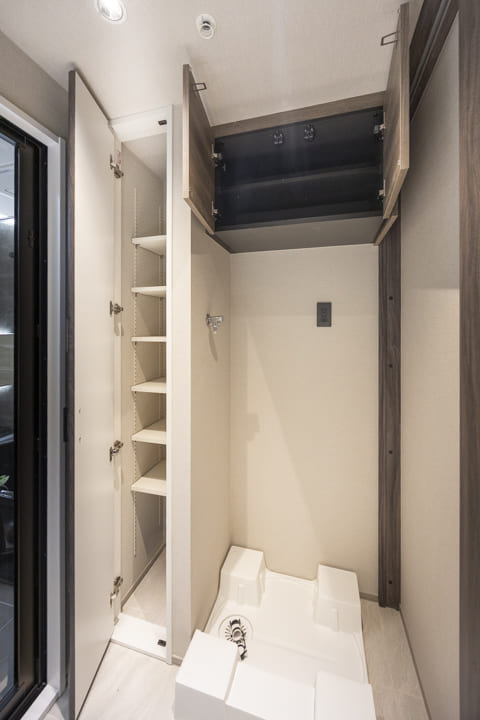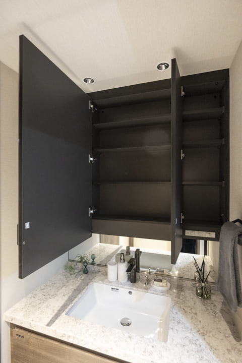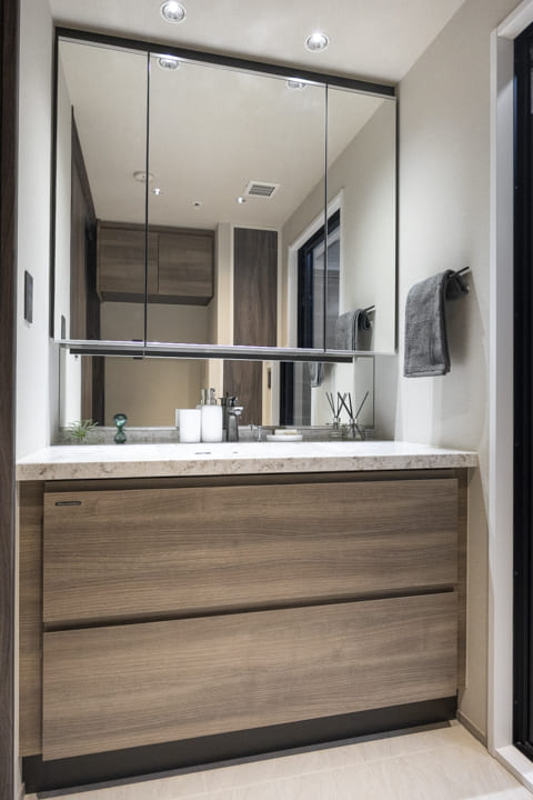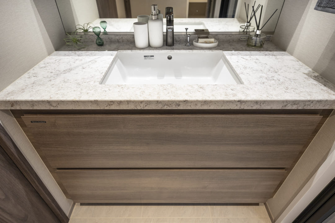 石調カウンターが洗練された印象をもたらす洗面化粧台。カウンターには化粧品やドライヤーを置けるゆとりがあり、忙しい朝の身支度も落ち着いて行えそうです。ミラーボックスや引き出しに加え、背面にはリネン庫も設置。タオルや洗剤類をすっきりと収め、清潔感のある洗面室を保てそうです。