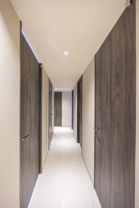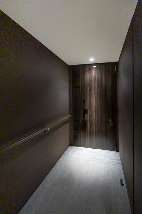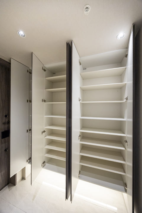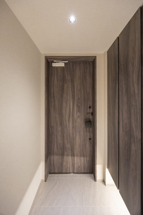 フットライトのやわらかな灯りが足元を包み込む、上質な玄関がお出迎え。トールタイプのシューズボックスを備え、いつも清潔な空間を保つことができます。廊下にはトランクケースや季節家電の収納に便利な納戸も設置。すっきりと整った住空間を支える、頼もしい収納スペースです。
