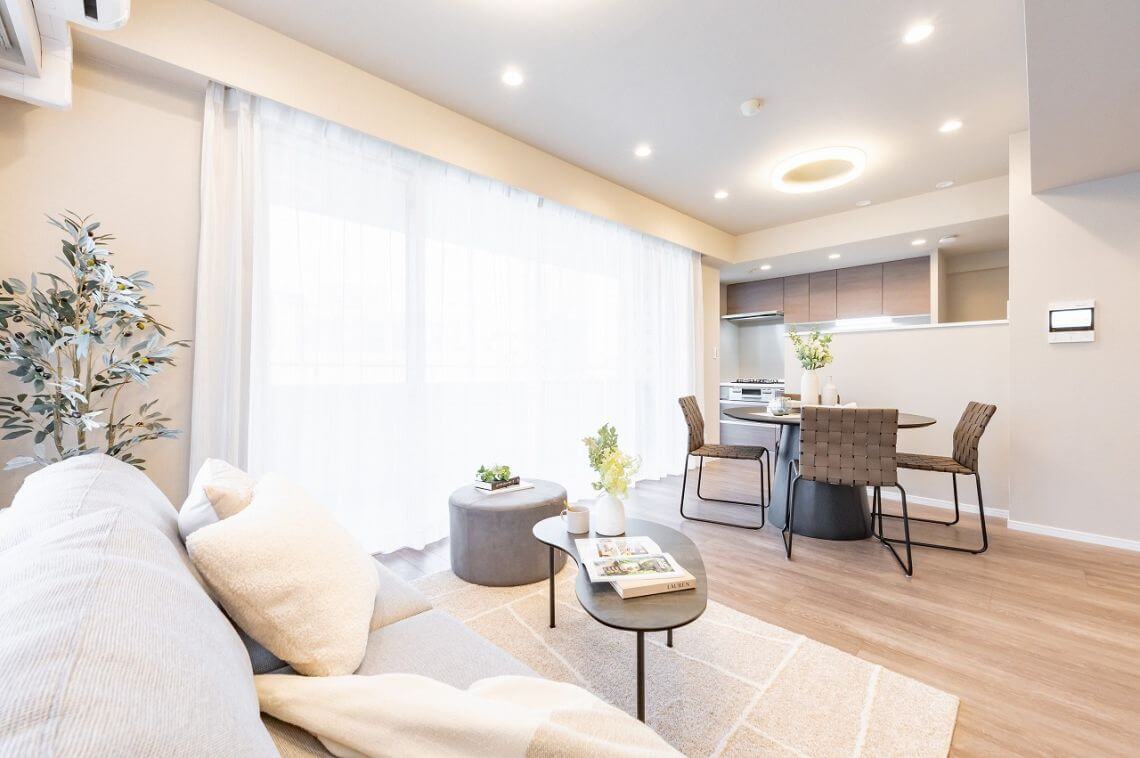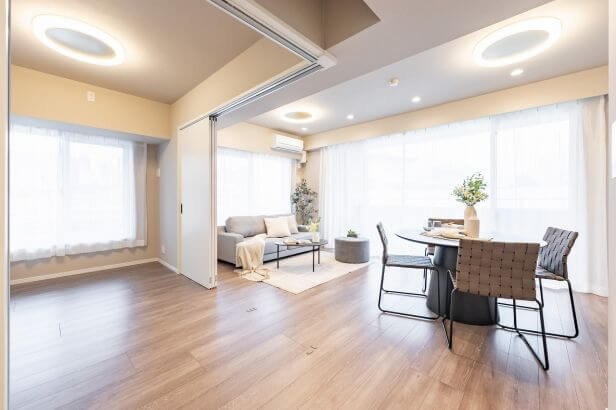 キッチンスペースを含め、約15.4帖のLDK。家族でゆったり過ごせる広さです。二面採光で窓が多く開放感たっぷり。バルコニーとルーフバルコニーへの出入りが可能です。また、リビングと隣接している洋室4と繋げてより広々過ごすこともできます。ライフスタイルに合わせて様々な使い方ができそうですね。