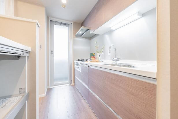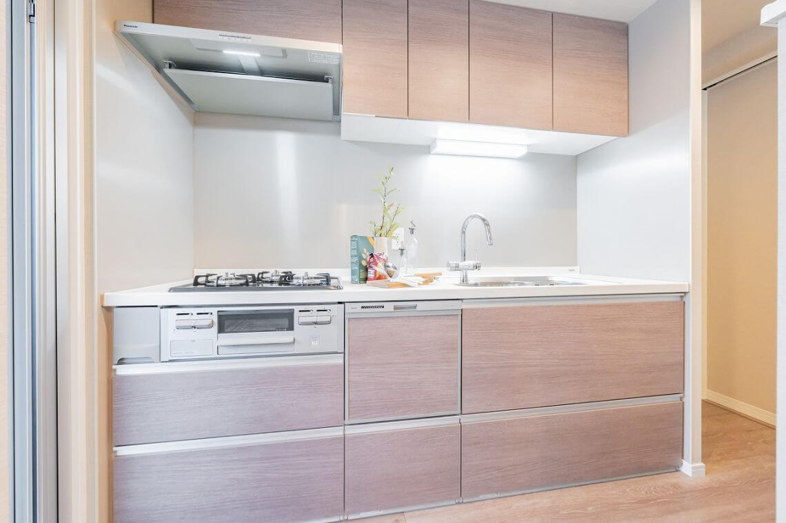料理が捗る3口ガスコンロ、家事の時短に心強い食洗機付きのシステムキッチン。カップボードも設置されていて、収納スペースも確保されています。キッチン奥の勝手口からバルコニーへの出入りも可能です。