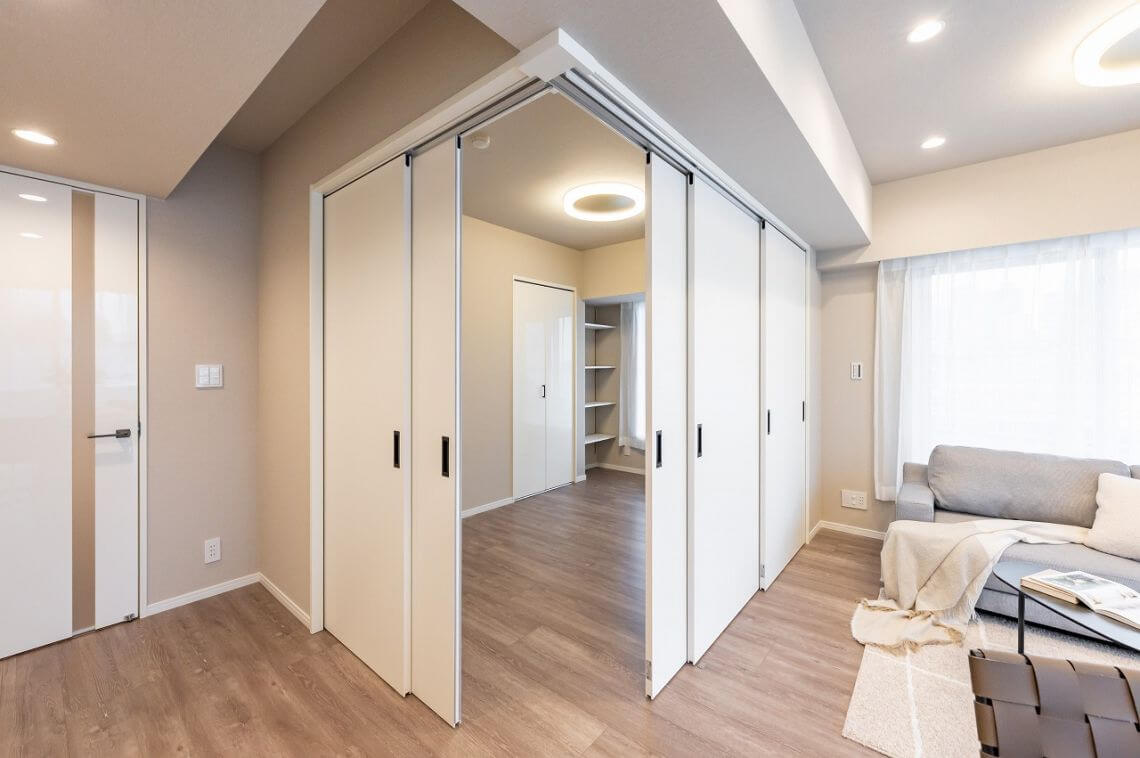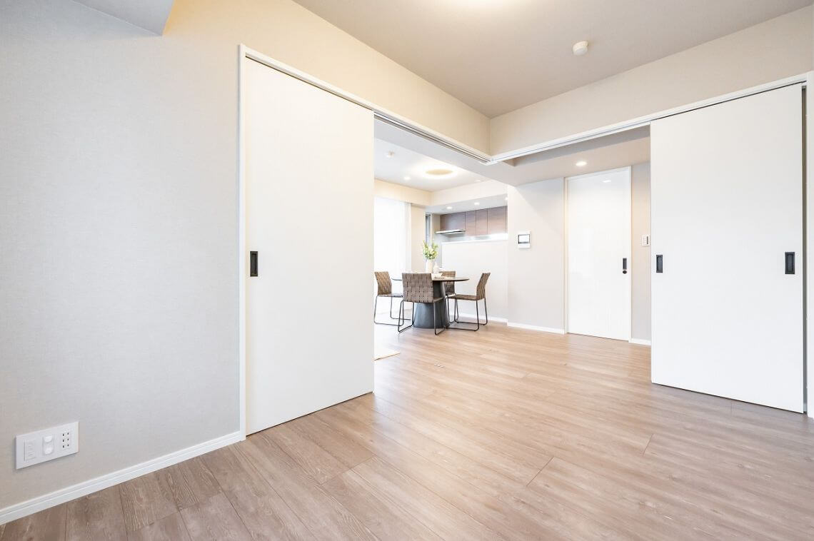 リビングダイニングと隣接した約5.3帖の洋室4。扉の開口部が広くとられていて、空間を繋げて開放的に過ごせます。床にドアレールがないので見た目もすっきりとした印象。レールにホコリがたまる心配もないので衛生的にも◎です。ワークスペースや趣味部屋、キッズルームなど、ライフスタイルに合わせて様々な使い方ができます。
