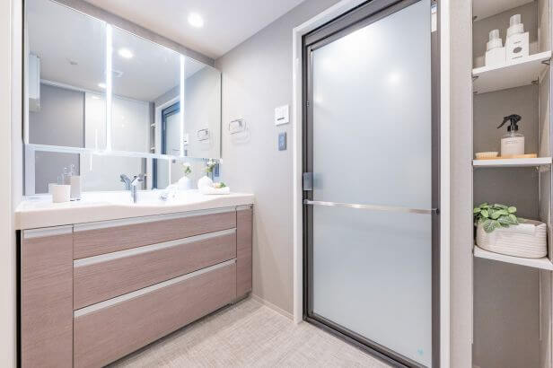 縦のライン照明が美しい洗面化粧台。洗面まわりの小物がすっきり整頓できるミラーボックス付きで、いつでも整った状態をキープできそうですね。リネン庫として使える可動棚も備わっています。