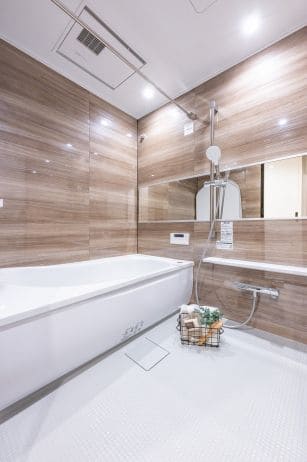ウッド調であたたかみのある雰囲気のバスルーム。1418サイズです。浴室換気乾燥機とランドリーパイプ付きで雨の日や冬場の洗濯にも困りません。