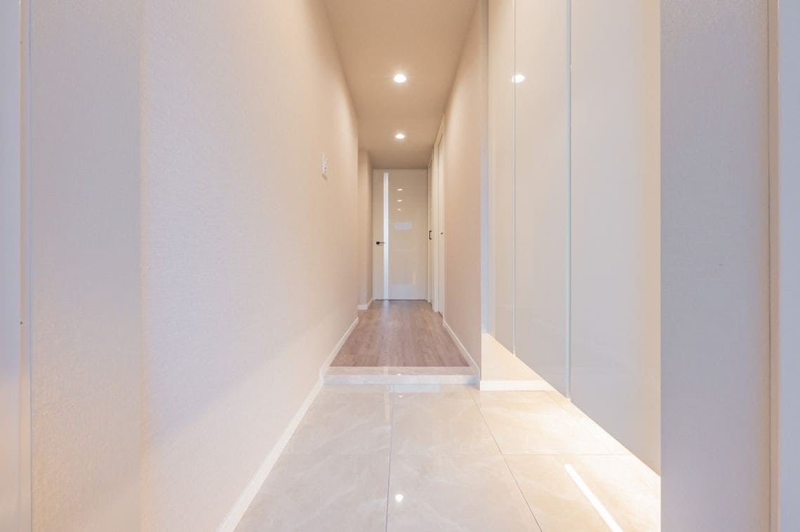玄関には3枚扉のシューズボックスを完備。靴がたっぷり収納できます。足元をやさしい光で照らしてくれるフットライト付です。