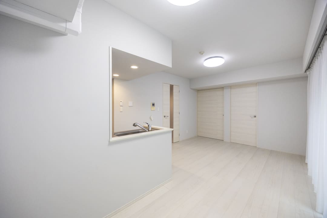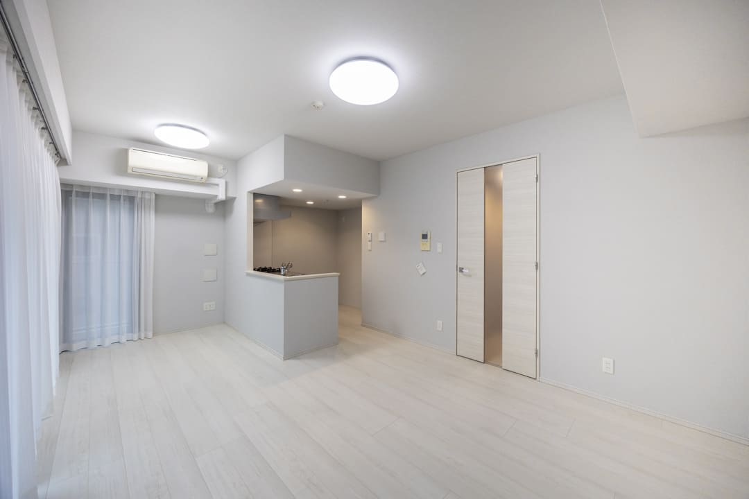 約13.1帖のリビングダイニングキッチンです。大きく造られた窓からはバルコニーにアクセスができます。南東向きのため日当たりも良好。また、フローリングには床暖房が付いているので、足元からぽかぽか温まることができます。床暖房は、床から直接伝わる熱(伝導熱)と床から部屋全体に広がる熱(ふく射熱)の組み合わせで暖まります。埃が舞いにくく、空気が乾燥しにくいのも◎です。