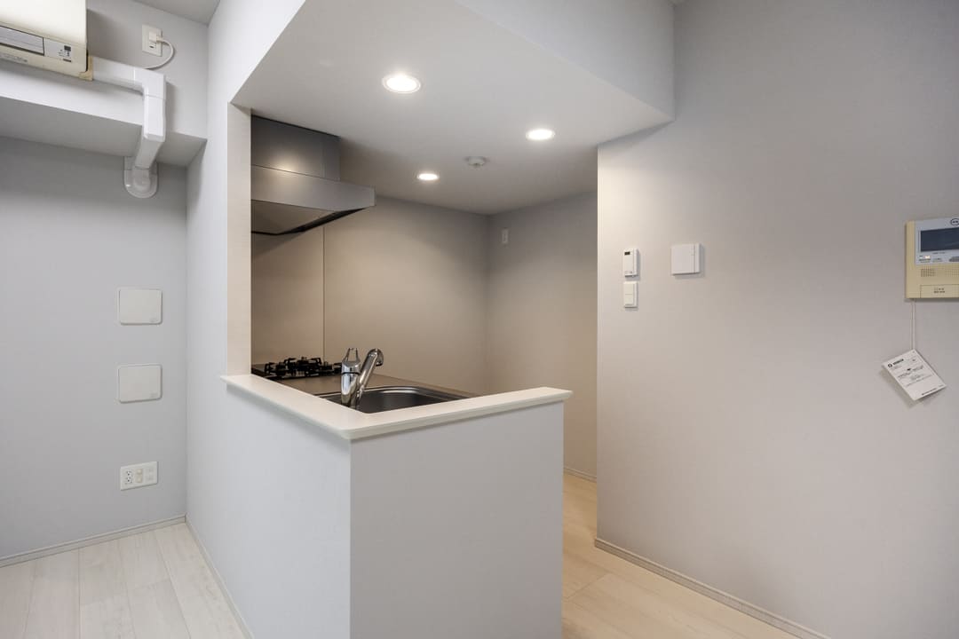 キッチンは、リビングダイニングを見渡しながら料理ができる対面式です。家族や来客とのコミュニケーションが取りやすくて◎。しかし、コンロ側には壁がたっているので、油跳ねなどの心配はありません。
