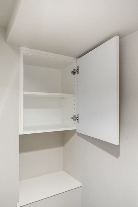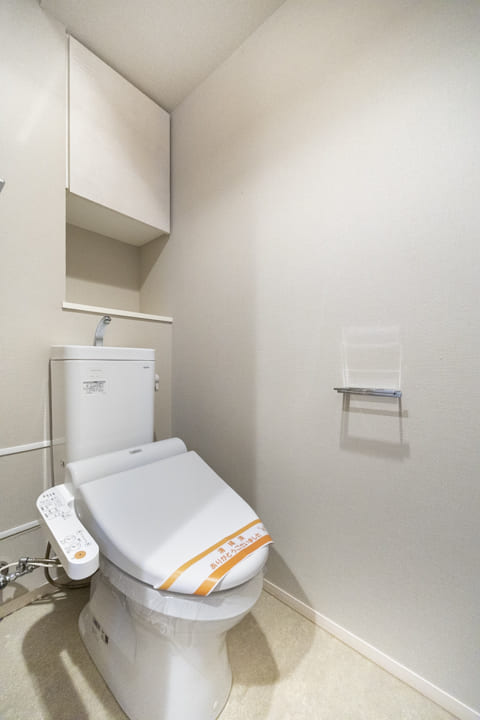 ウォシュレット一体型のトイレです。背面側には棚が造られているので、トイレットペーパーや掃除用具などが収納できます。カウンタースペースには小物やアロマを飾っても◎。