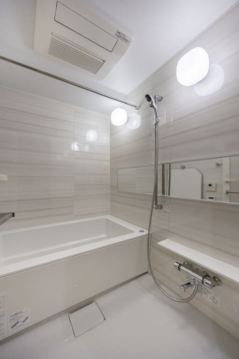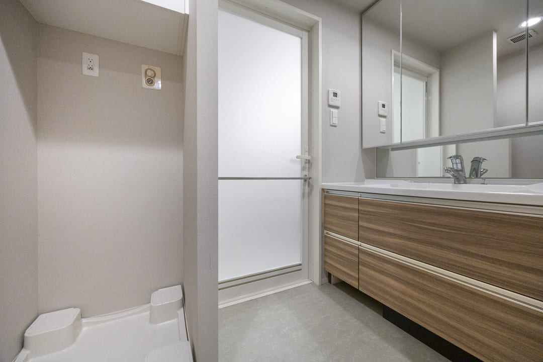 ベージュトーンで落ち着いた雰囲気を演出しているバスルームです。お風呂にゆっくり浸かるのが好きという方に嬉しい追い焚き機能を搭載。家族の入浴時間がずれてしまっても安心です。浴室乾燥機には暖房・乾燥・換気・ミストサウナの機能がついており、一年中快適に過ごすことができます。