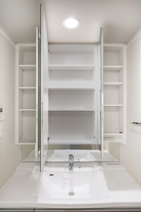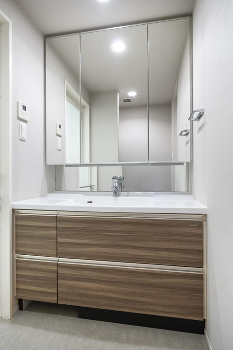 三面鏡の中に化粧品などを収納できて使い勝手良好な化粧台です。水栓の背面側も鏡になっているので、座りながらでも鏡が見やすくなっています。