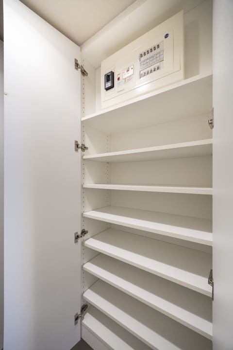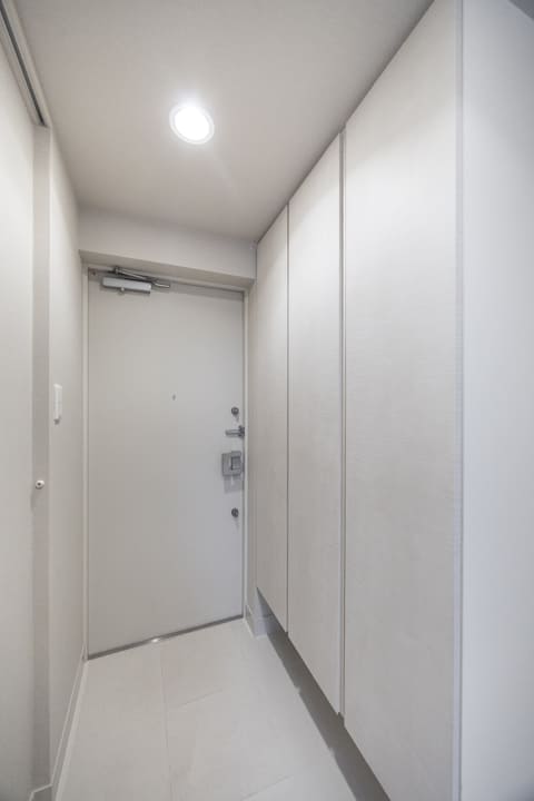 淡い色でまとめられた清潔感のある玄関です。シューズボックスは高さがありますが、フロートタイプのため空間に圧迫感を与えません。中には可動棚が設置されているので、持っている靴に合わせて調節が可能です。