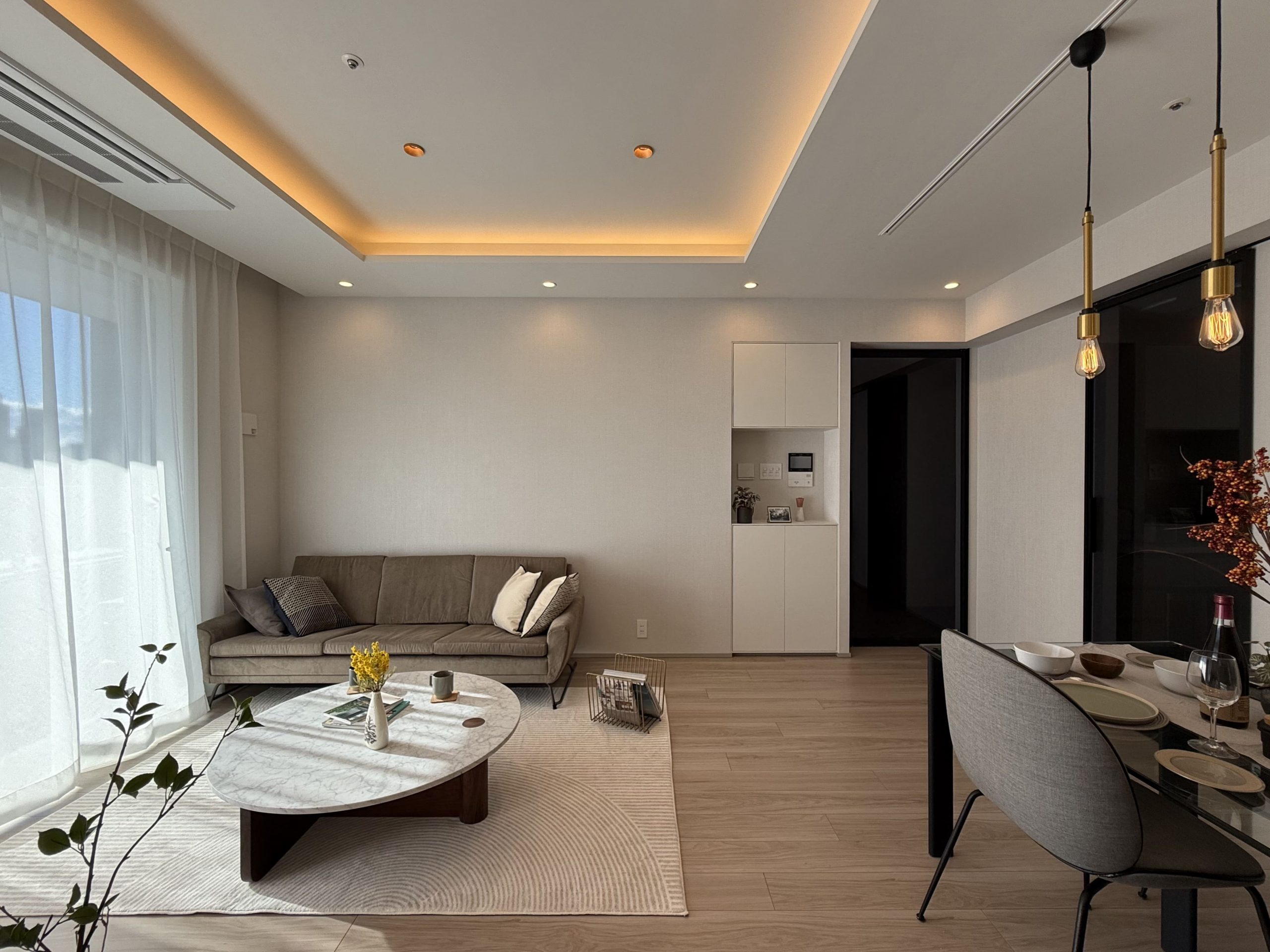 約12.8帖のリビングダイニングは、折り上げ天井と間接照明がホテルライクで上質な雰囲気を演出しています。南向きの大きな窓から自然光が差し込み、明るく開放感のある空間が広がります。また、壁面には洗練されたデザインのアクセントクロス+ピクチャーレールが施されており、壁を傷つけずに絵画やグリーンなどを飾ることができるようになっています。