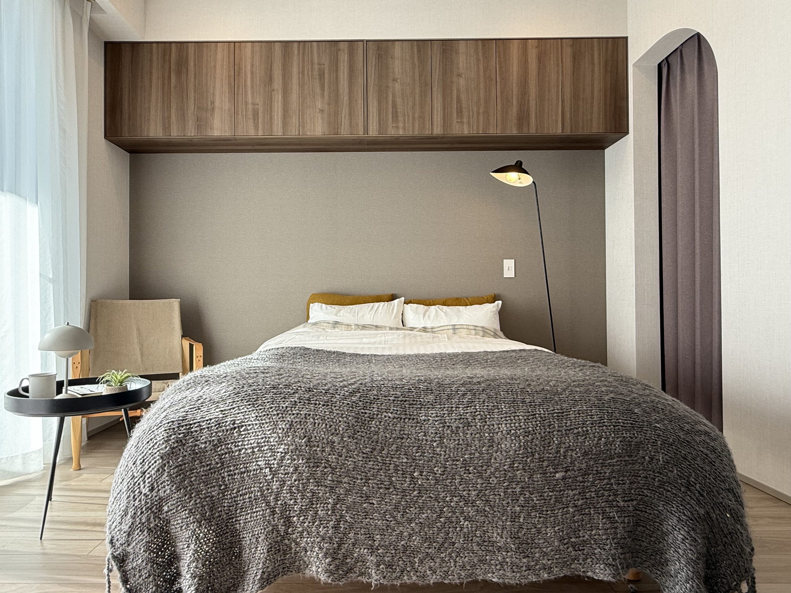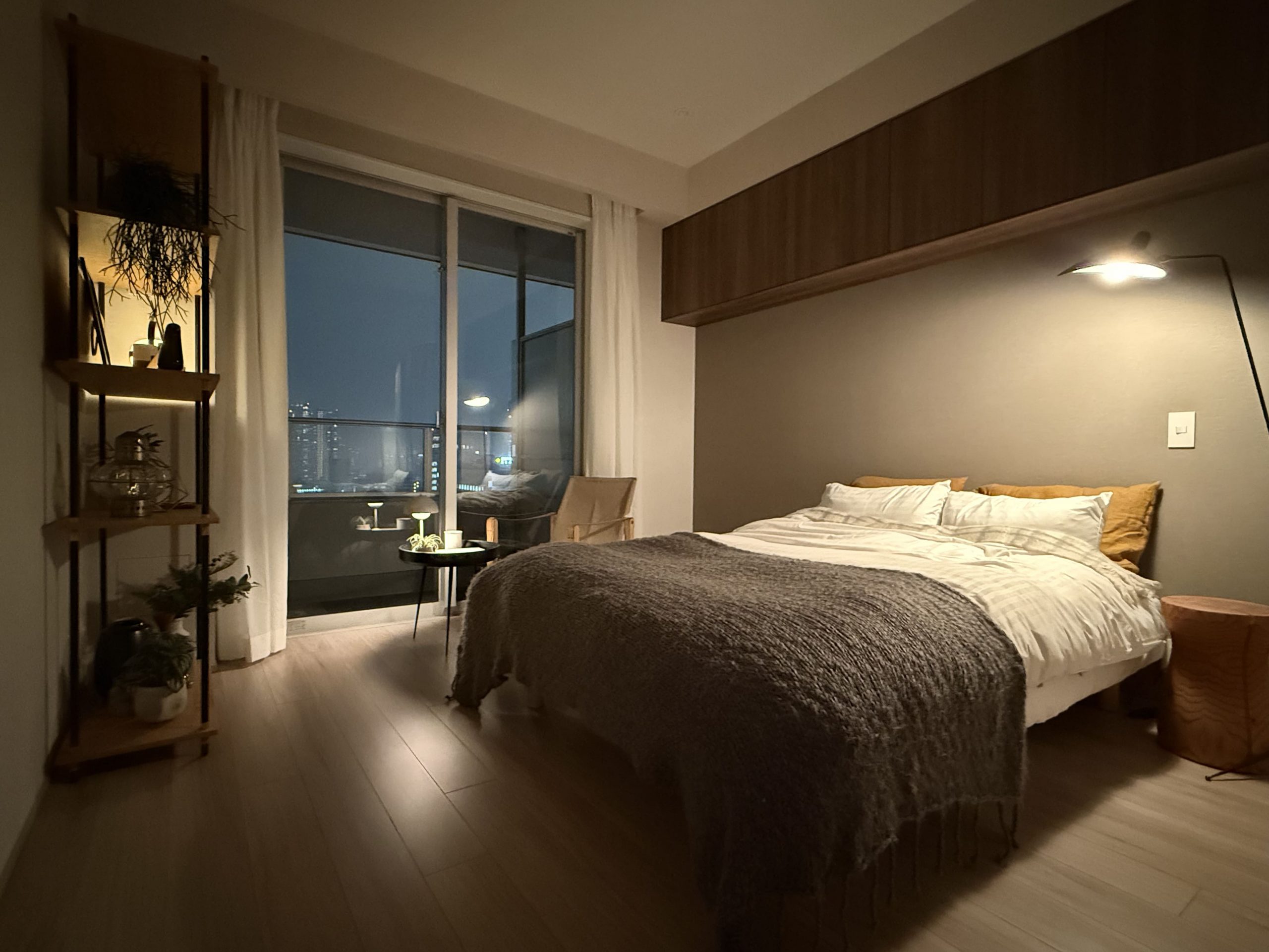 約7.6帖の主寝室はグレートーンのアクセントクロスで落ち着いた雰囲気を漂わせています。木目柄の吊戸棚には小物などを収納できるようにもなっていて便利。夜には夜景も楽しめそうです。また、約1.3帖のウォークインクローゼットも付いているので、収納スペースも豊富に確保されています。