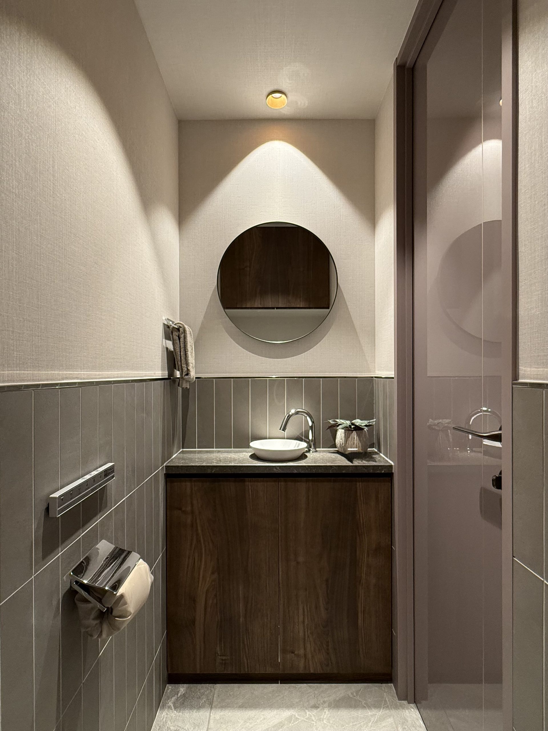 ウォシュレット一体型のトイレです。タンクレスタイプなのですっきりとした印象に。また、別途で手洗い器と鏡が造られているので、その場でサッと身だしなみを整えることができます。吊戸棚が設置されていて、収納スペースも確保されていますよ。
