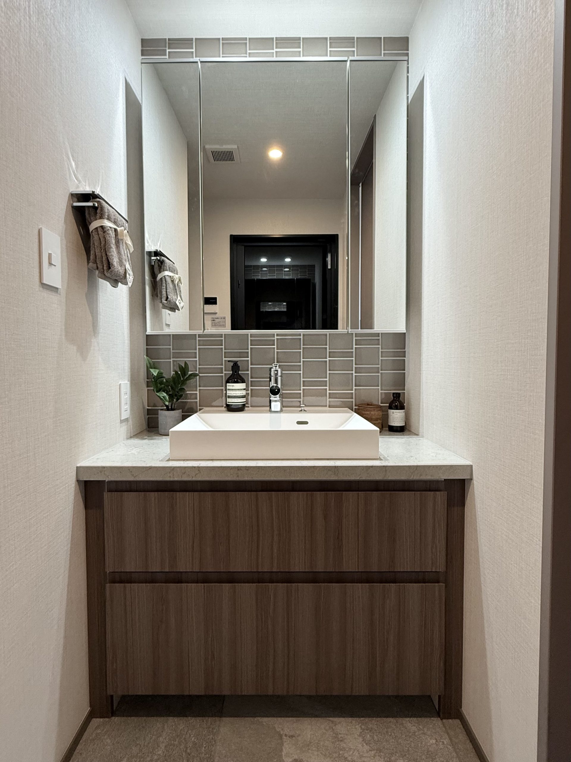 置き型式の洗面ボウルがおしゃれな化粧台です。三面鏡の中には化粧品などを収納できて使い勝手良好。横の壁面にはコンセントがあるので、ドライヤーなども使いやすそうです。