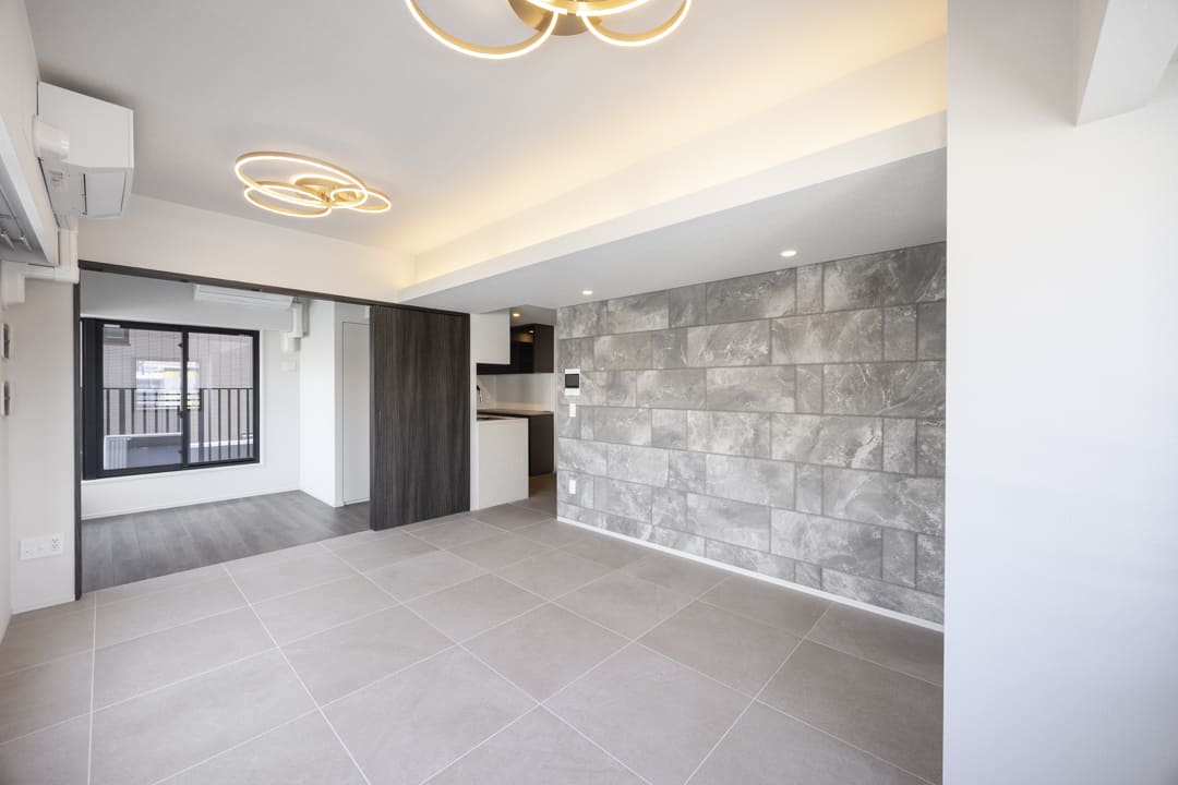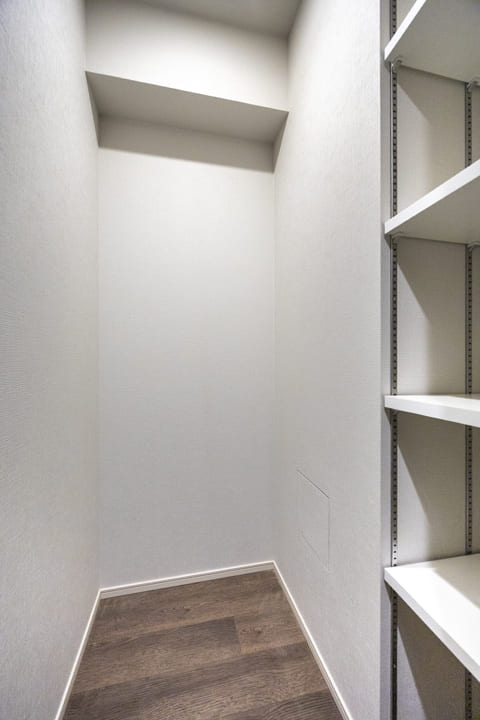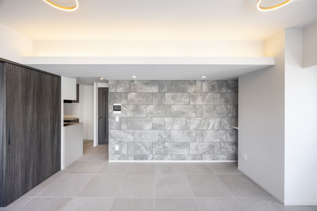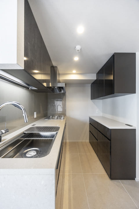 生活空間から程よく切り離された独立型キッチンは、落ち着いて調理に集中できる上質な設計。石調カウンターが重厚感を添え、空間全体に洗練された印象をもたらします。キッチンまわりの生活感をさりげなく抑えられるほか、調理中のにおいがリビングへ広がりにくい点も魅力です。
