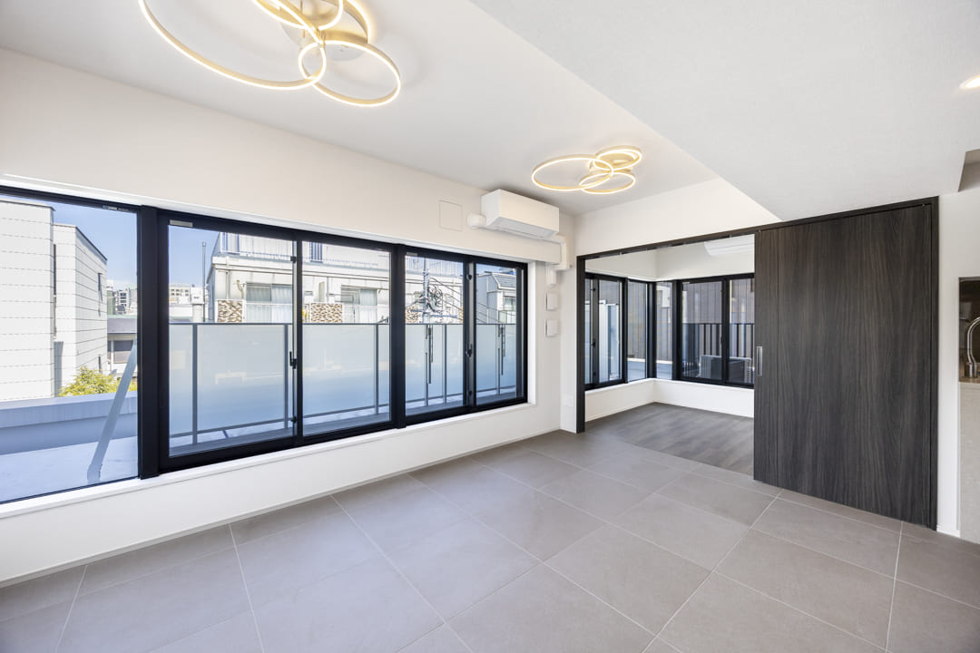 北西二面採光により、やわらかな自然光が届くリビングダイニング。キッチンと合わせて約13.4帖の広さがあります。両隣に住戸のない3方向角住戸のため独立性が高く、開放感のある暮らしが叶います。さらに、隣接する洋室との間仕切り戸を開ければ、17帖超のゆとりある一体空間に。シーンに応じてフレキシブルに活用できます。