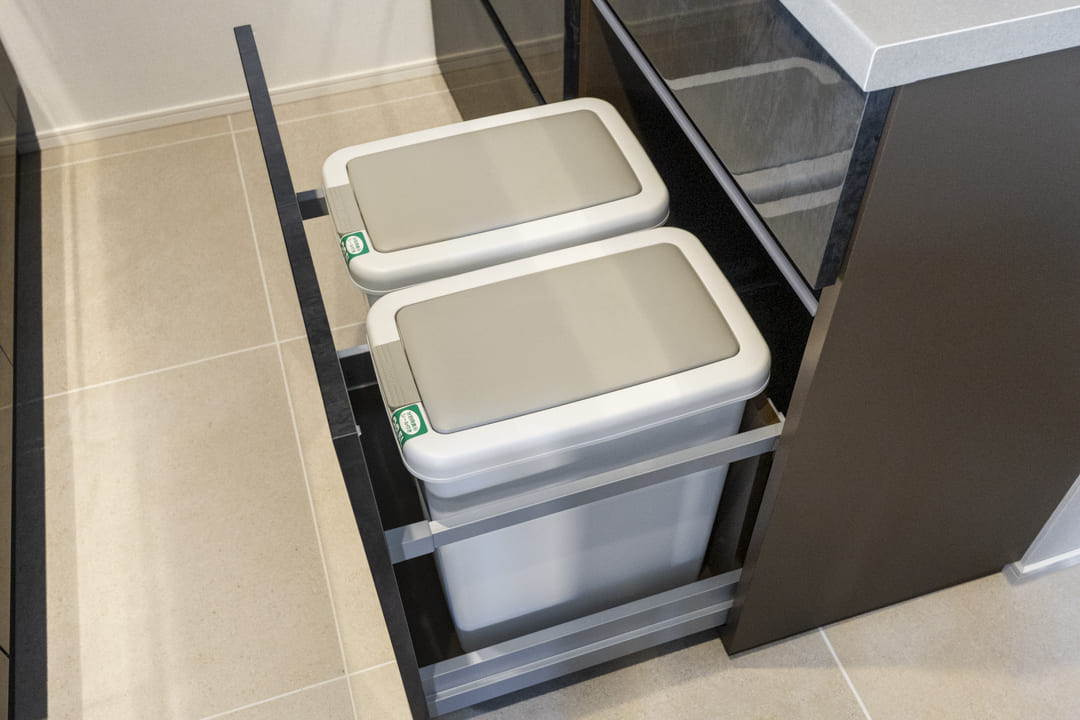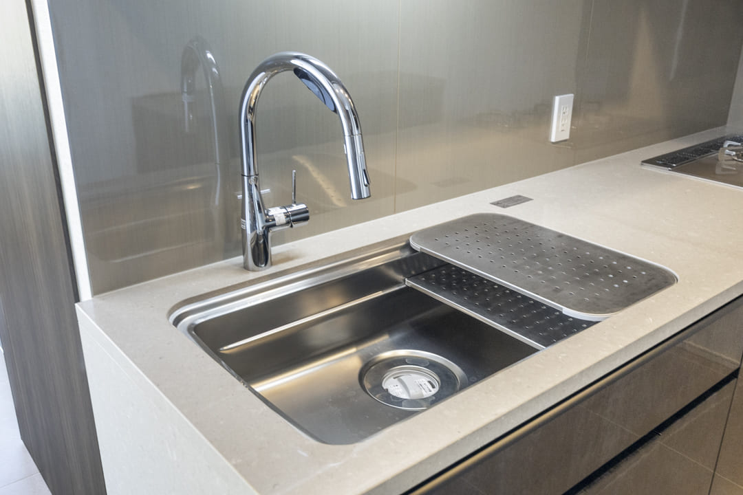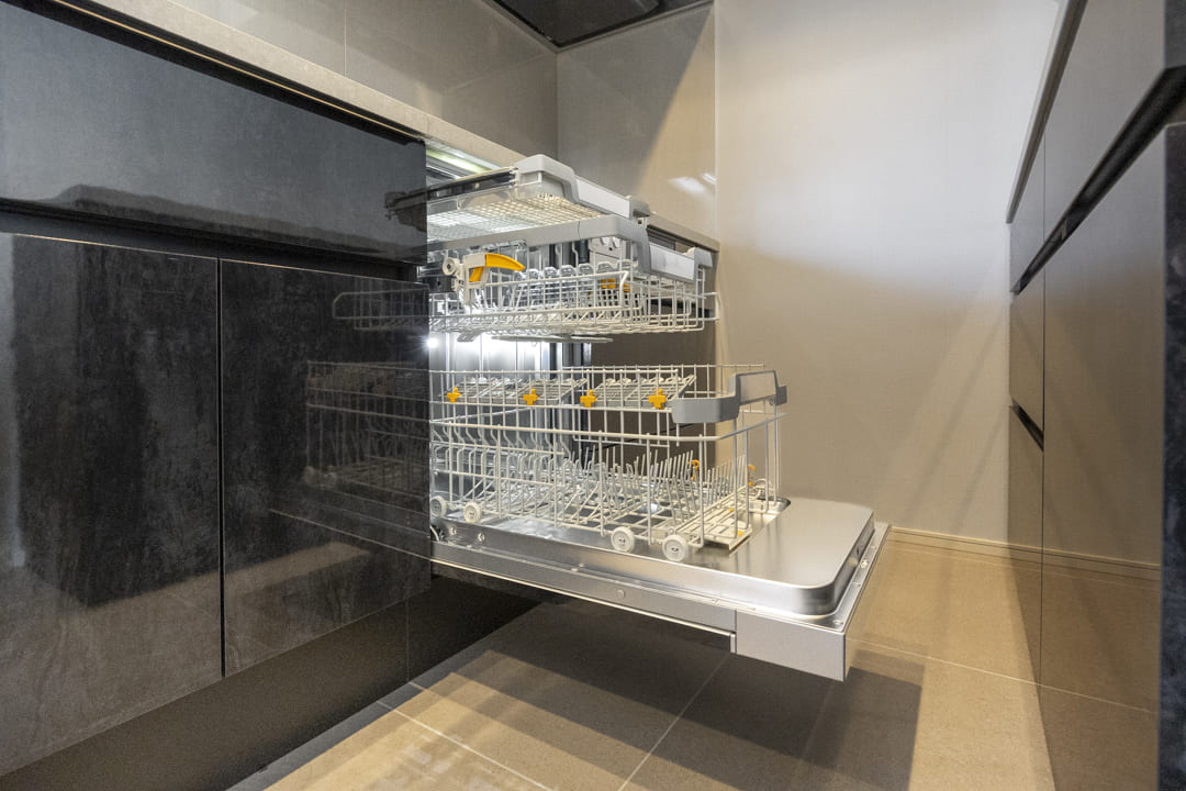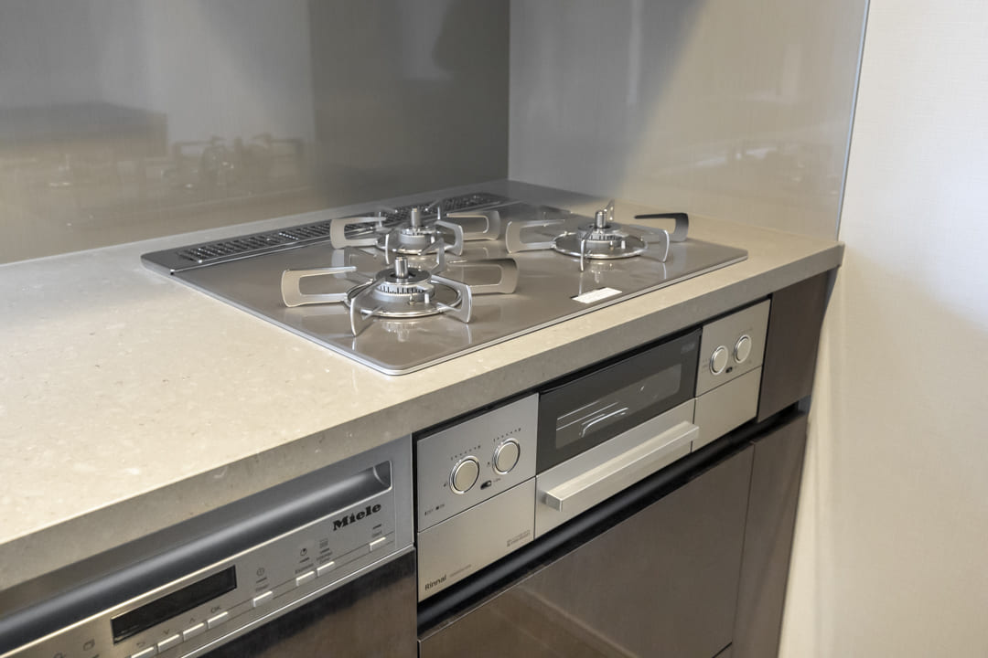 同時調理が叶うグリル付3口ガスコンロ、調理の際に手軽においしい水を使用できる浄水器一体型水栓を搭載。さらに、Miele(ミーレ)製の大型食洗機、ディスポーザーも完備されています。食器洗いが捗り、後片付けの時短に。料理後すぐに生ゴミを処理できるので、悪臭の原因を防ぎ、掃除の手間も軽減できます。