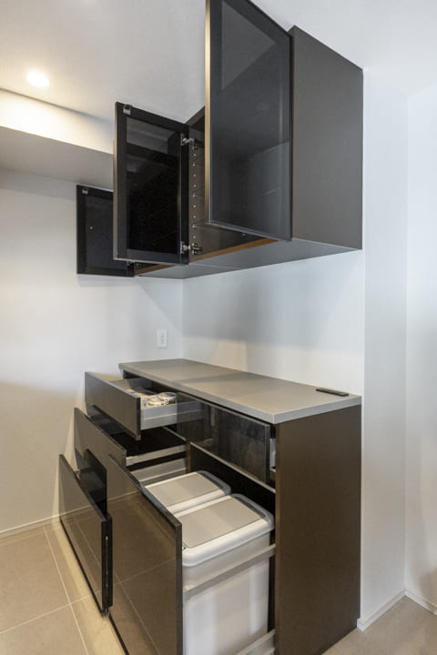 背面には造作のカップボードを設置。食料品のストックや食器類を整頓でき、散らかりがちなキッチンまわりがすっきり片付きそうです。ワゴン式のダストボックスで、生活感が出てしまう部分をさりげなくカバーできるのも嬉しいポイント。カウンターにはコンセントが付いていて、炊飯器やコーヒーメーカーといったキッチン家電の使用に便利です。
