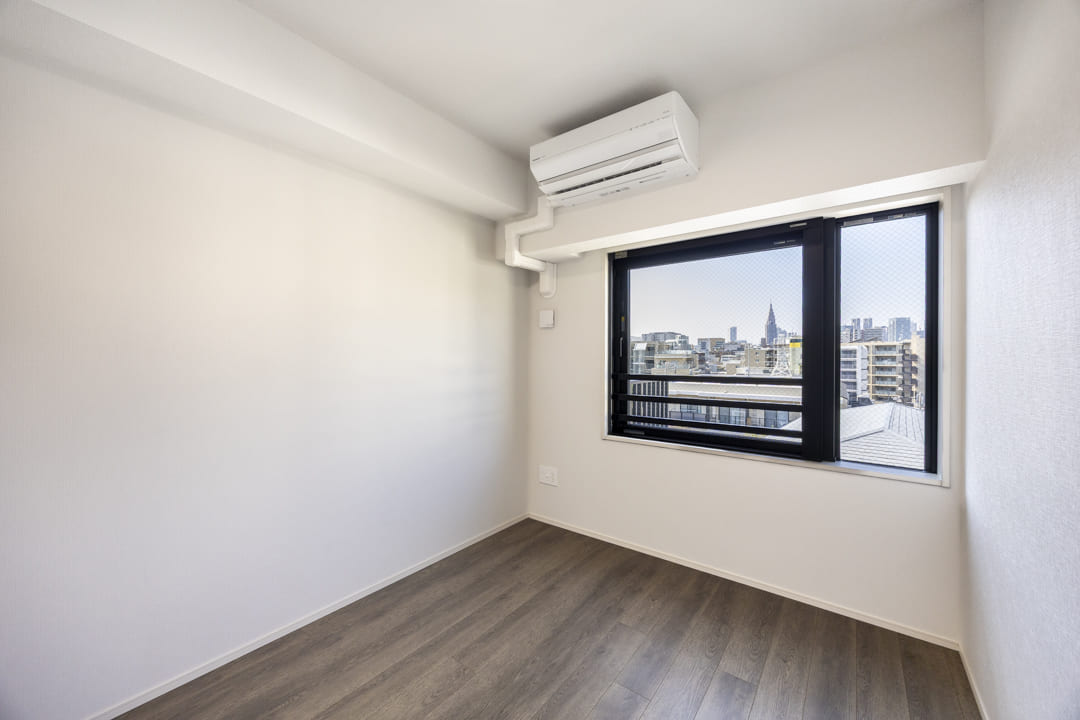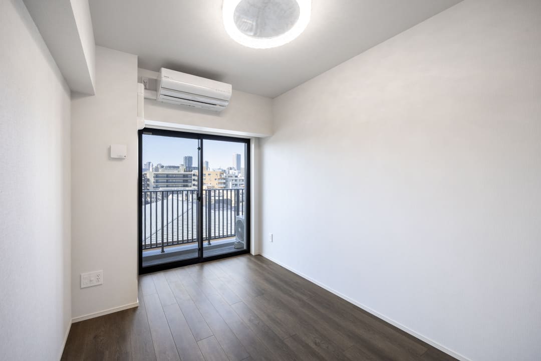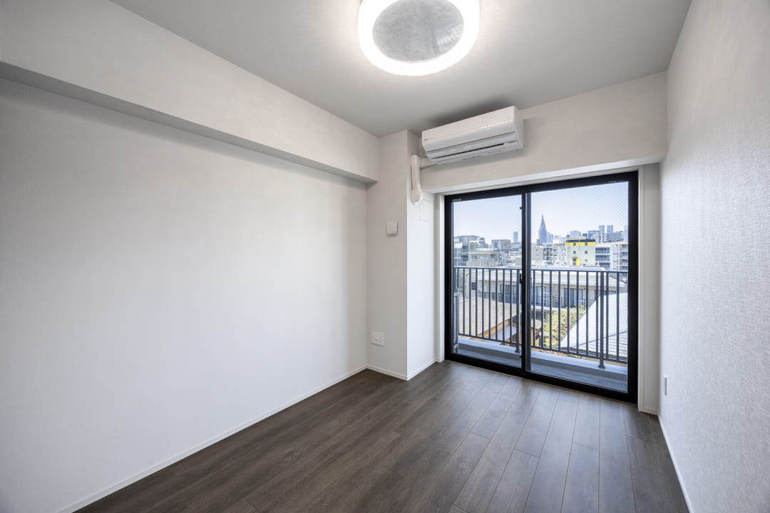 約6.0帖の洋室1。バルコニー付きで開放感があり、主寝室にぴったりのお部屋です。窓の奥には青空が広がり、日々の喧騒を忘れさせてくれる落ち着いたひとときを演出。リビング同様に床暖房が敷設されていて、寒い季節も快適にお過ごしいただけます。