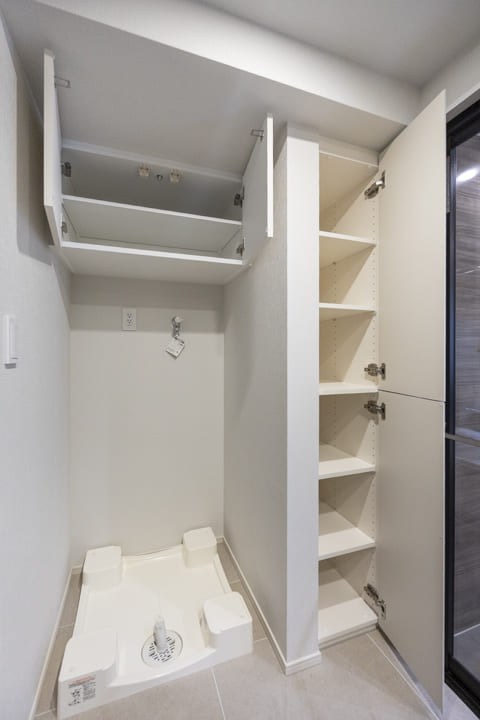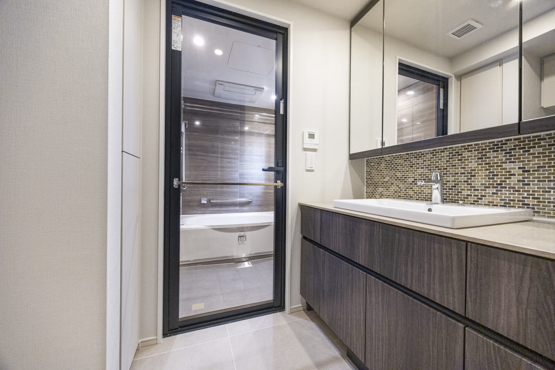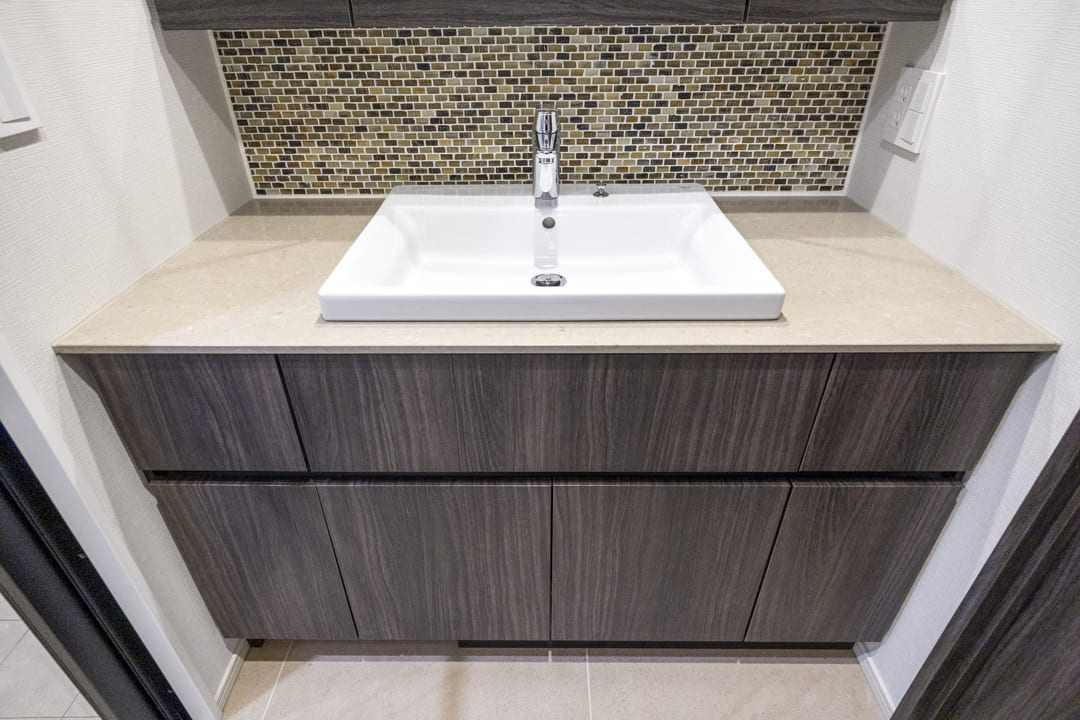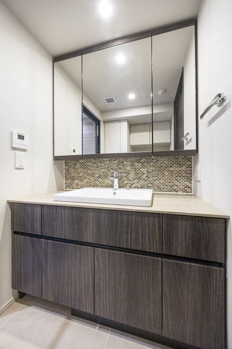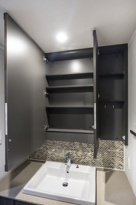 モザイクタイルが印象的な洗面化粧台。大きな三面鏡を備え、身だしなみを整えるのに便利です。カウンターには化粧品やドライヤーを置けるゆとりがあり、忙しい朝の身支度も落ち着いて行えそうです。ミラーボックスと足元収納に加え、背面にはリネン庫を完備。洗面まわりの小物からタオル・パジャマ類まですっきり収納可能です。