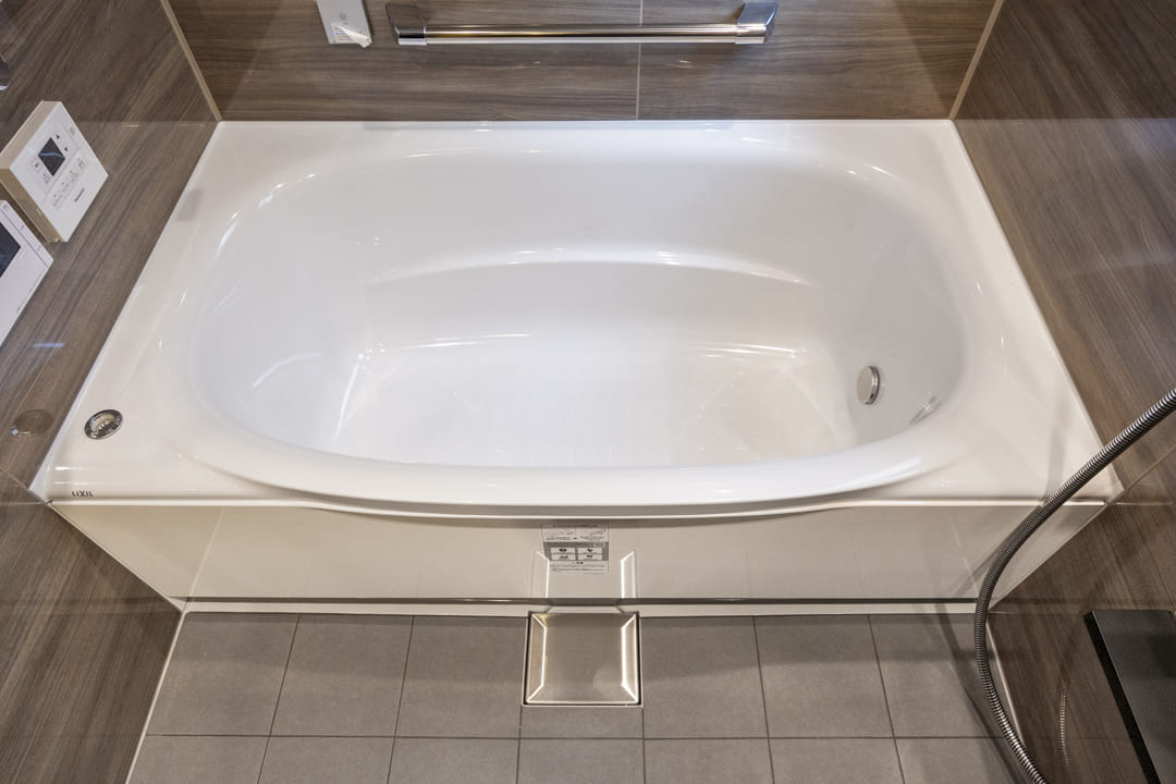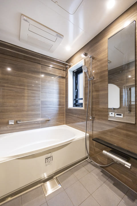 窓から明るい光が届く、1418サイズのバスルーム。自然換気が可能で、湿気がこもりがちな空間にも配慮された設計です。浴室換気乾燥暖房機や追い焚き機能に加え、ミストサウナも搭載した充実の仕様。発汗によるリフレッシュやボディケアなど、目的に応じて活用できる機能性を備え、日々のバスタイムをより心地よい時間へと高めます。