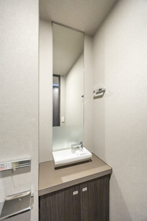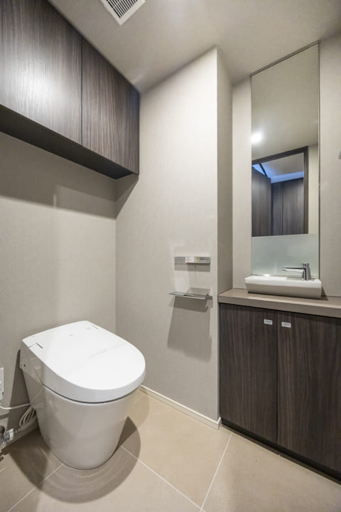 廊下に面していて独立性の高いレストルーム。LIXIL製の温水洗浄機能付トイレを採用しています。独立した手洗いカウンターも備え、清潔感のある空間。すぐに手を洗うことができ、ゲストを洗面室まで案内する手間もかかりません。