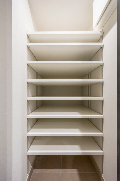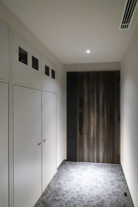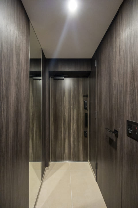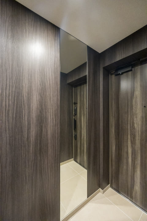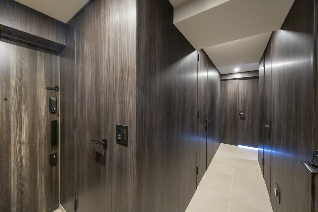木目パネル仕上げで、洗練された木の温もりを感じる玄関ホール。全身鏡が奥行きをもたらし、お出かけ前のコーディネートチェックにも便利です。SIC(シューズインクローゼット)完備で、散らかりがちな靴をすっきり収納可能。廊下には約0.7帖の納戸もあり、季節家電や日用品ストックの収納に重宝しそうです。
