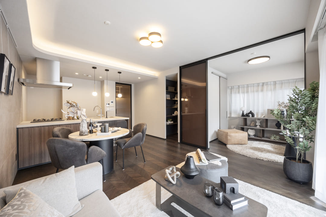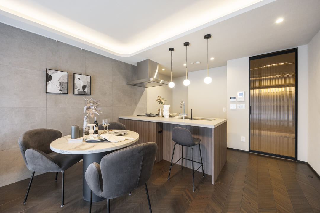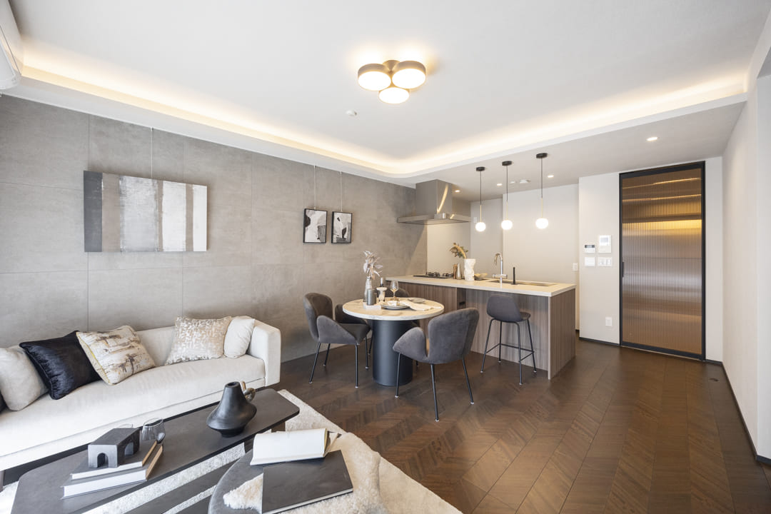 約15.4帖のゆとりがあるリビングダイニングキッチンです。南東向きのため日当たりが良好。グレートーンのアクセントウォールは洗練された印象で、ピクチャーレールが設置されているため、壁を傷つけずに絵画などを飾ることができます。また、天井には間接照明があしらわれており、上質さもプラスしてくれていますよ。