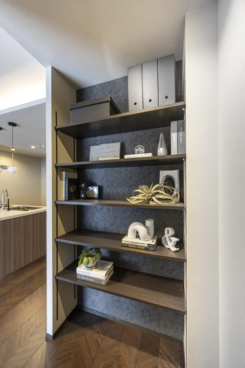 リモートワークや収納スペースとして使えるDENが造られています。壁面には可動棚が設置されているので、本や小物などをディスプレイすることができますよ。