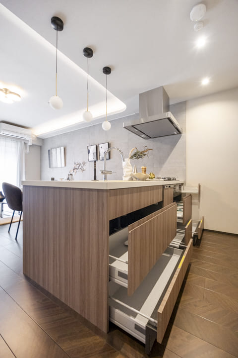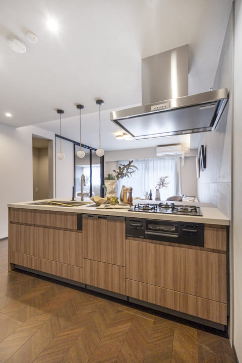 キッチンは、リビングダイニングを見渡しながら料理ができる対面式です。家族や来客とのコミュニケーションが取りやすくて◎。