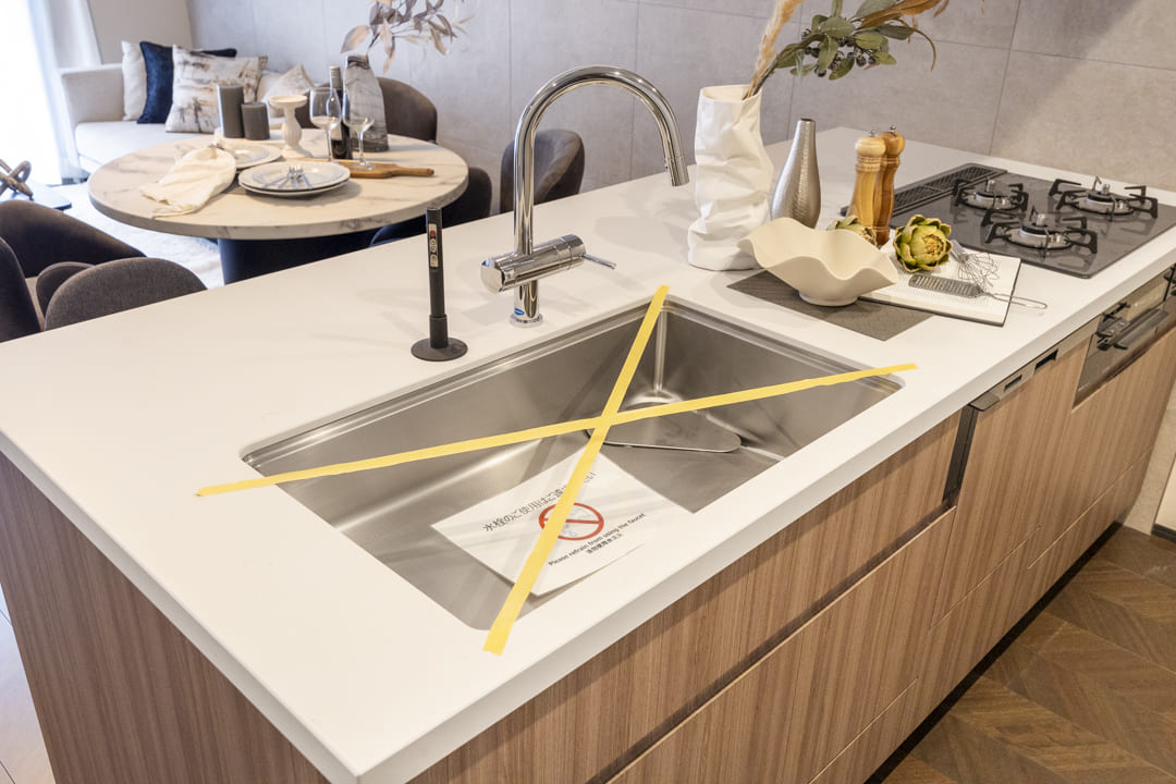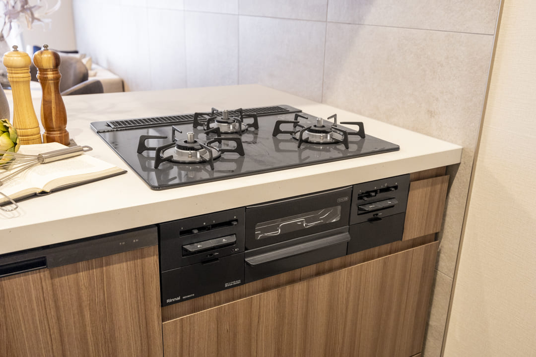 3口コンロ、グリル、食洗機付きと設備面も充実しています。シンクも広々としているので野菜などが洗いやすそうですよ。