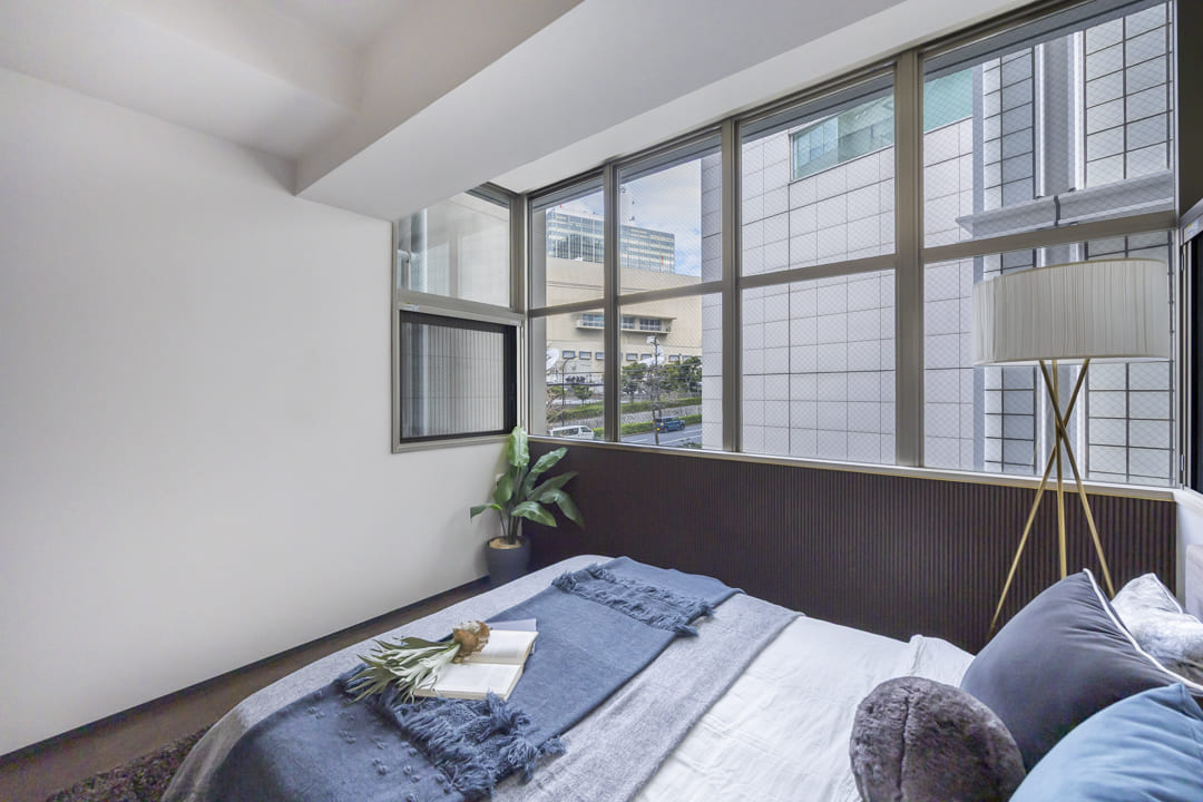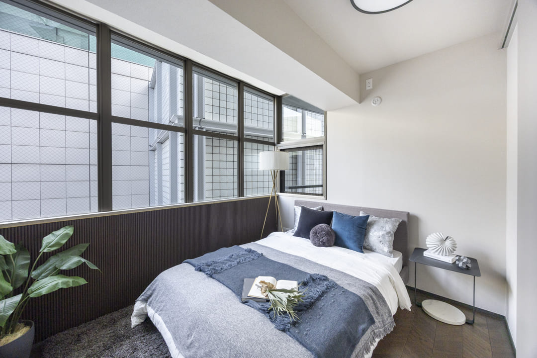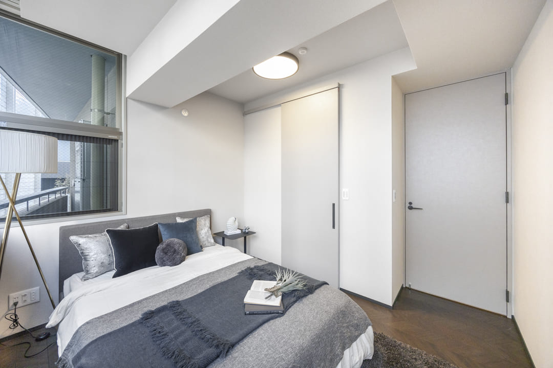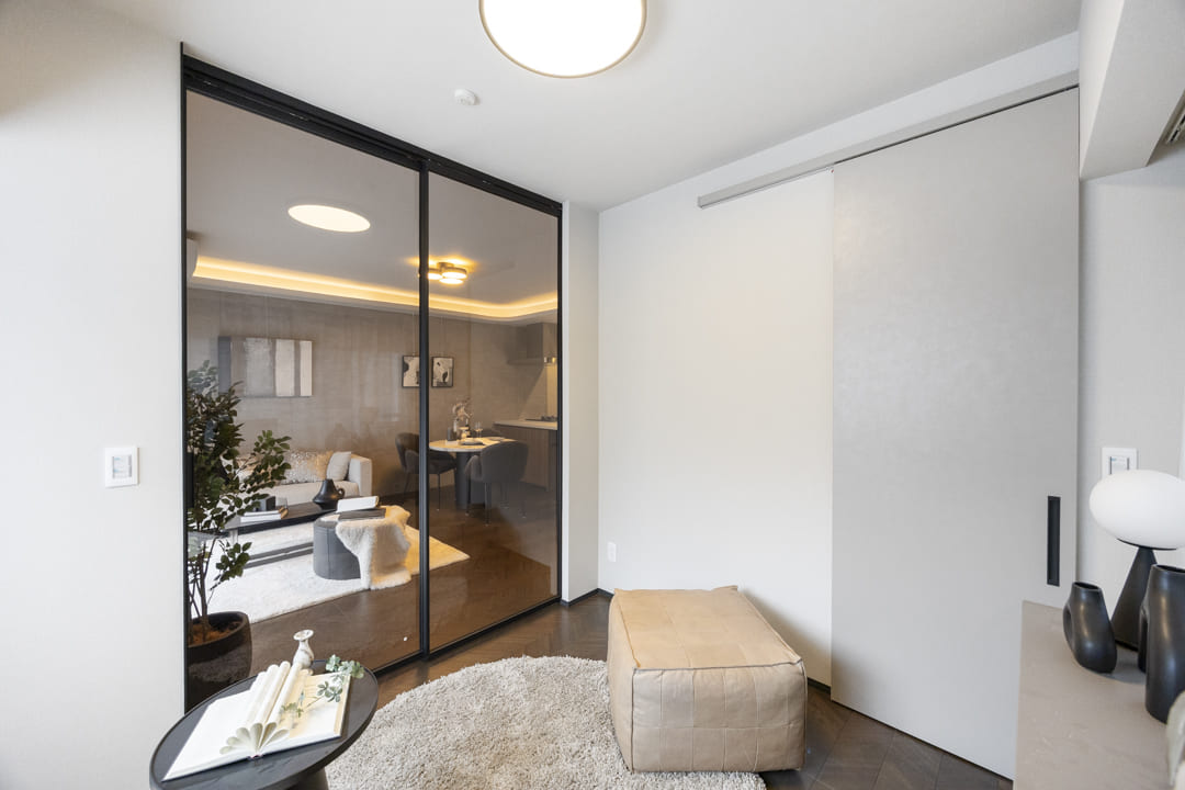約5.8帖の洋室1は二面採光で開放感があります。リビングダイニングキッチンとの仕切り扉には透け感があるので、圧迫感を与えず、開ければお部屋を繋げて使うこともできます。また、奥行きがあるウォークインクローゼット付きのため、洋服や大きめの荷物も収納が可能です。