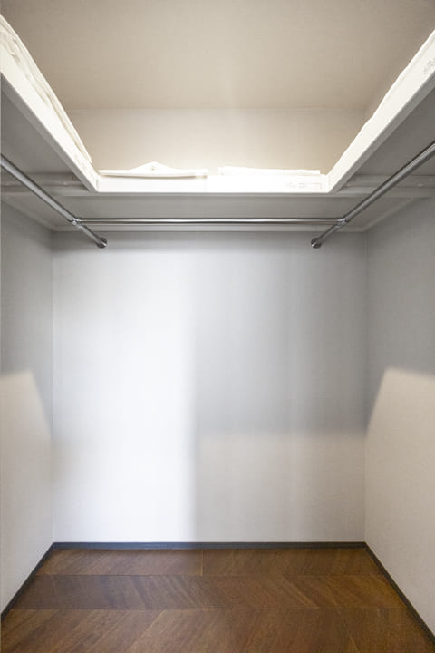 約5.4帖の洋室2は、コの字型の窓がお部屋に広がりを与え、自然光を取り込みやすくしてくれています。腰壁のダークカラーのパネルが空間のアクセントに。また、こちらのお部屋にも奥行きがあるウォークインクローゼットが造られています。丈の長いコートやワンピースなども収納しやすく、スーツケースを並べたりもできそうです。