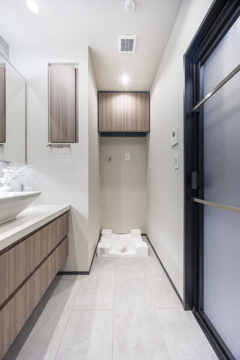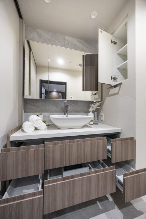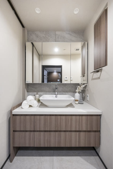 ホテルライクな置き型式の洗面ボウルです。三面鏡の中や壁面にある棚には化粧品やリネン類を収納することができます。カウンターも広めのため、使い勝手が良好です。