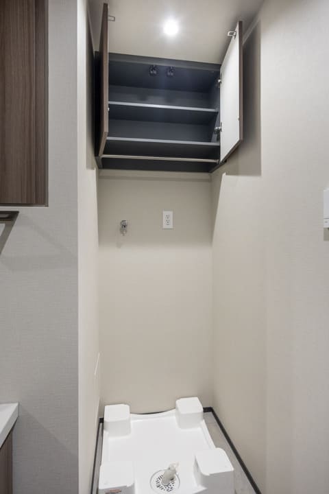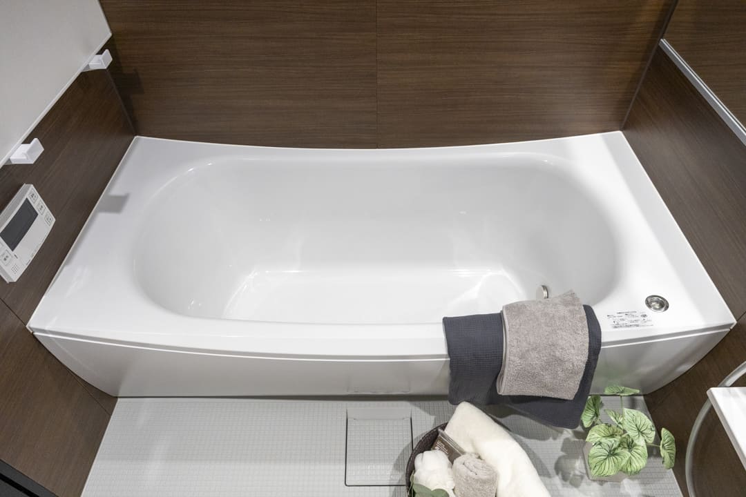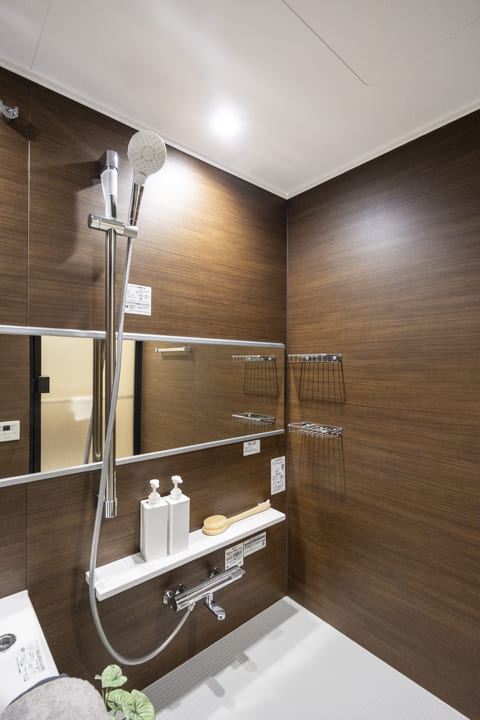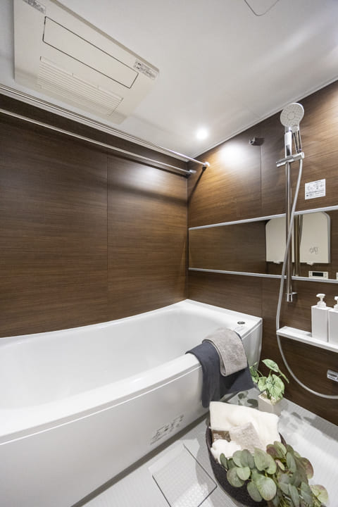 ブラウンの壁パネルが落ち着いた雰囲気を演出してくれている浴室です。お風呂にゆっくり浸かるのが好きという方に嬉しい追い焚き機能を搭載。家族の入浴時間がずれてしまっても安心です。また、浴室乾燥機には暖房・乾燥・換気・ミストサウナの機能がついており、一年中快適に過ごすことができます。