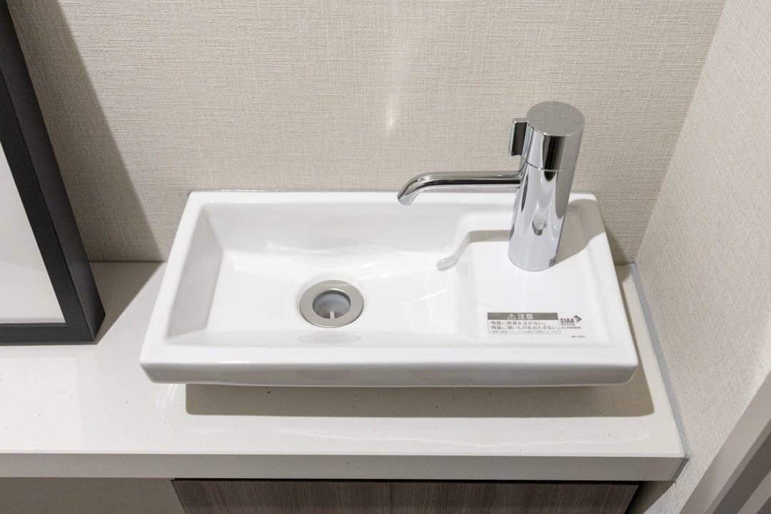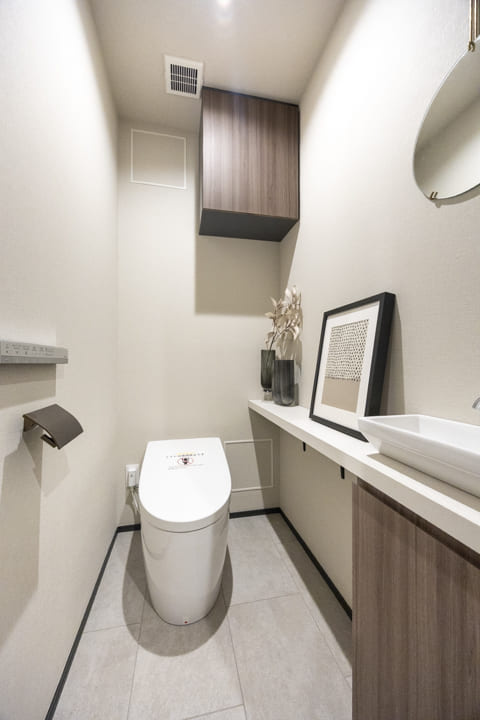ウォシュレット一体型のトイレです。タンクレスタイプなのですっきりとした印象に。また、別途で手洗い器が造られているので、すぐに手を洗うことができて衛生的です。上部には吊戸棚が設置されていて、収納スペースもありますよ。カウンタースペースにはアロマなどを置いても◎。