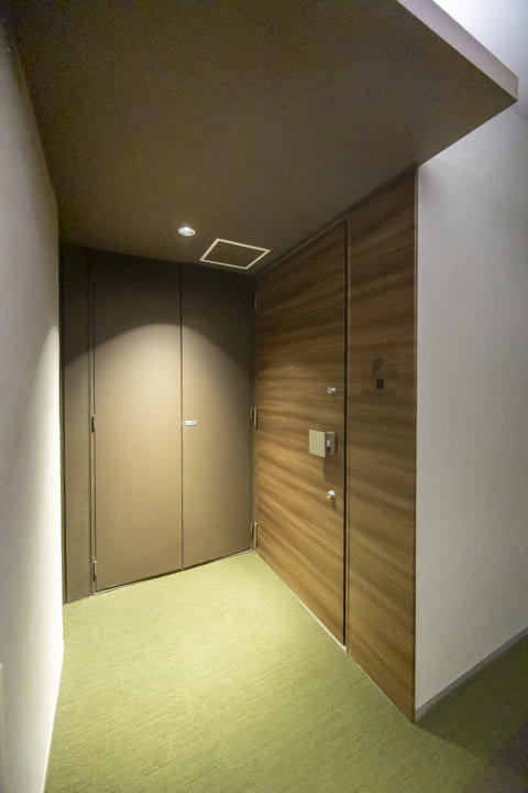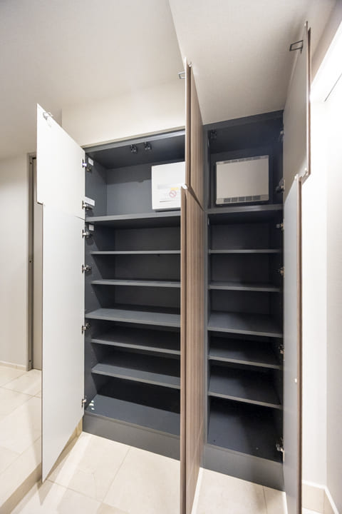 高級感を漂わせている玄関です。入って正面にはシューズボックスが備えつけられており、たくさんの靴が収納できます。壁面には間接照明+ピクチャーレールを設置することで、洗練された雰囲気に演出。