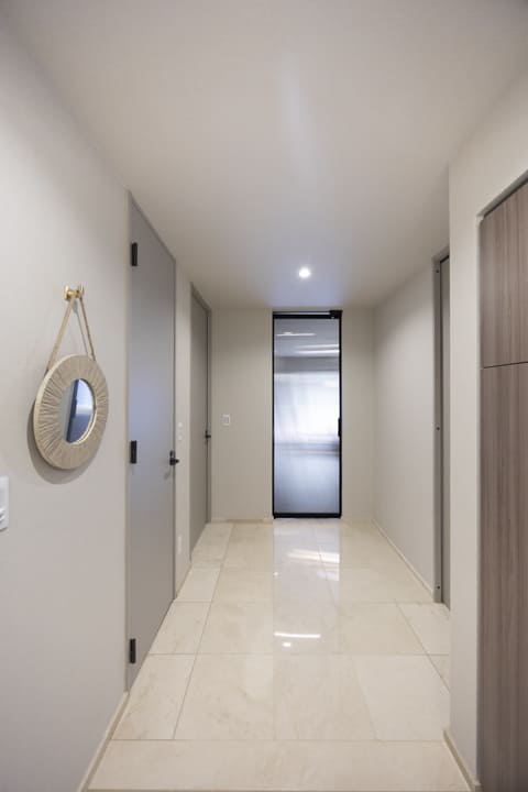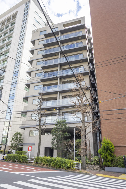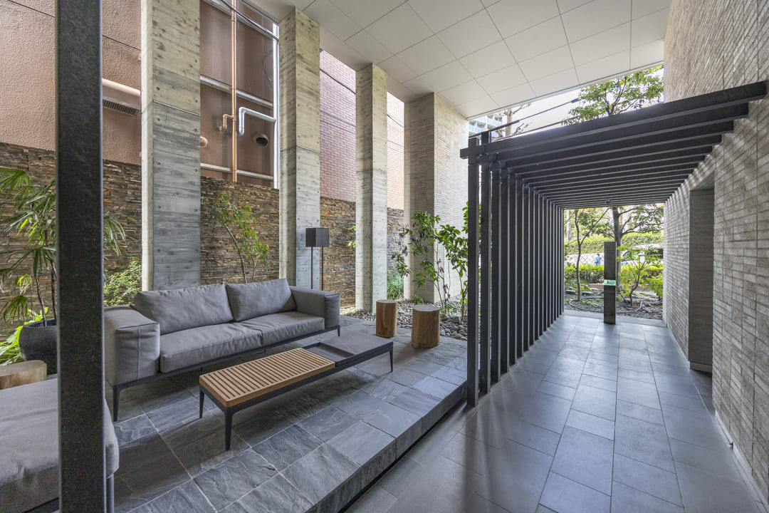 2013年(平成25年)12月竣工、総戸数34戸、鉄筋コンクリート造、10階建てのマンションです。共用部は無機質な素材と、自然の質感が絶妙にミックスされた空間。通路に設置された黒い垂直のルーバーが、奥へと続く奥行き感を強調し、プライベート空間への「切り替え」を演出しています。また、オートロック完備でセキュリティ面は安心。宅配ボックスも設置されているので、忙しい方でも時間を気にせずに荷物を受け取ることができます。細則はありますが、ペットの飼育も可能です。