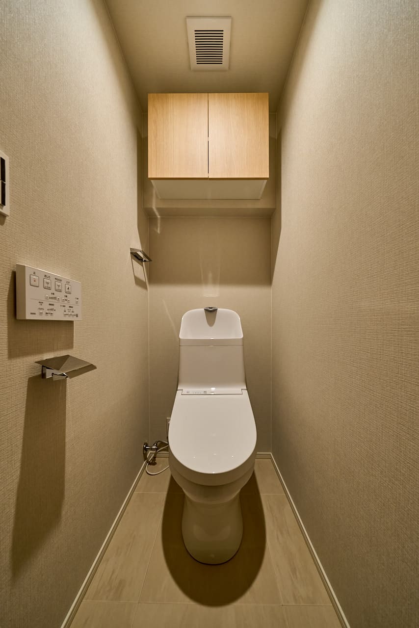 ウォシュレット一体型トイレです。上部には吊戸棚が設置されているので、トイレットペーパーや掃除用具などを収納することができます。