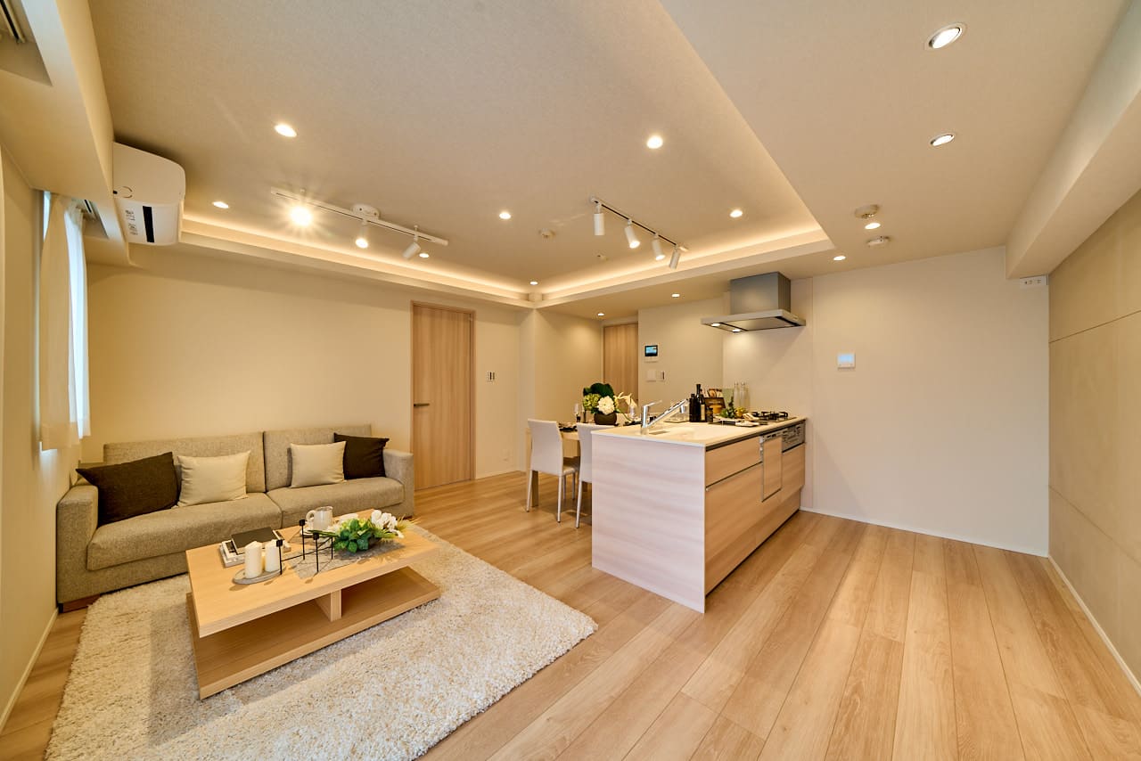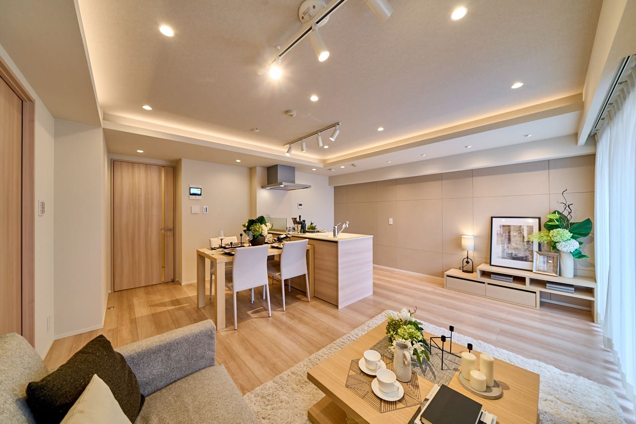 ゆとりのあるリビングダイニングキッチンは、グレートーンのアクセントクロスや間接照明が施されていて上品な雰囲気。南西向きのため日当たりも良好です。