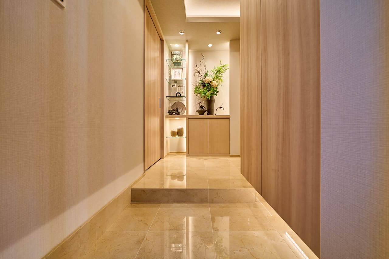大理石貼りの床で高級感が漂う玄関・廊下です。シューズボックスはフロートタイプのため空間に圧迫感を与えなくて◎。廊下にはニッチがあるので、お気に入りの小物やグリーンを飾ることができますよ。