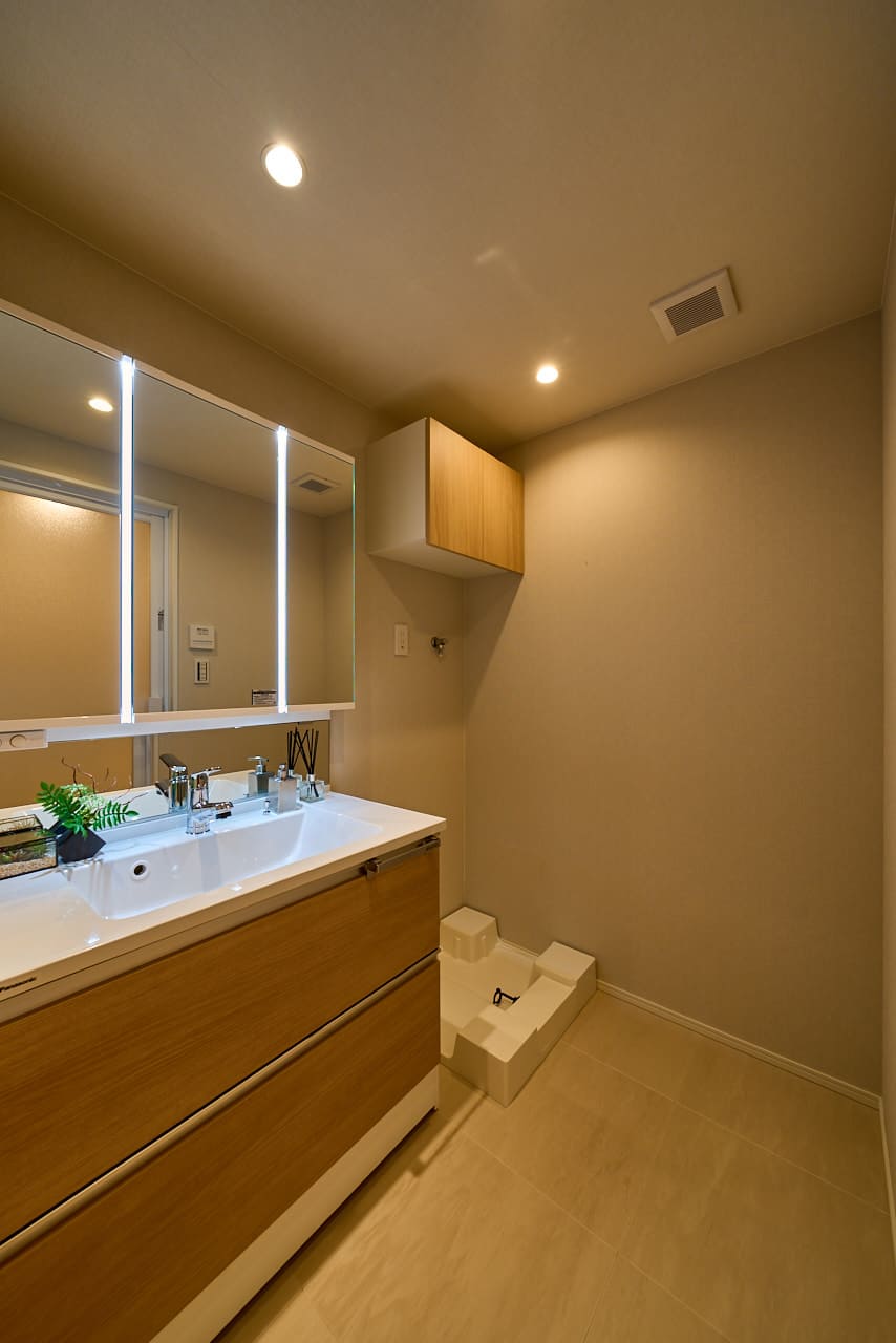 Panasonic製の洗面化粧台は、三面鏡の中に化粧品などが収納できて使い勝手が良好です。照明は縦に配置されているため、顔に影をつくらないのも◎。また、洗面ボウルとカウンターには継ぎ目がないのでお手入れも簡単です。