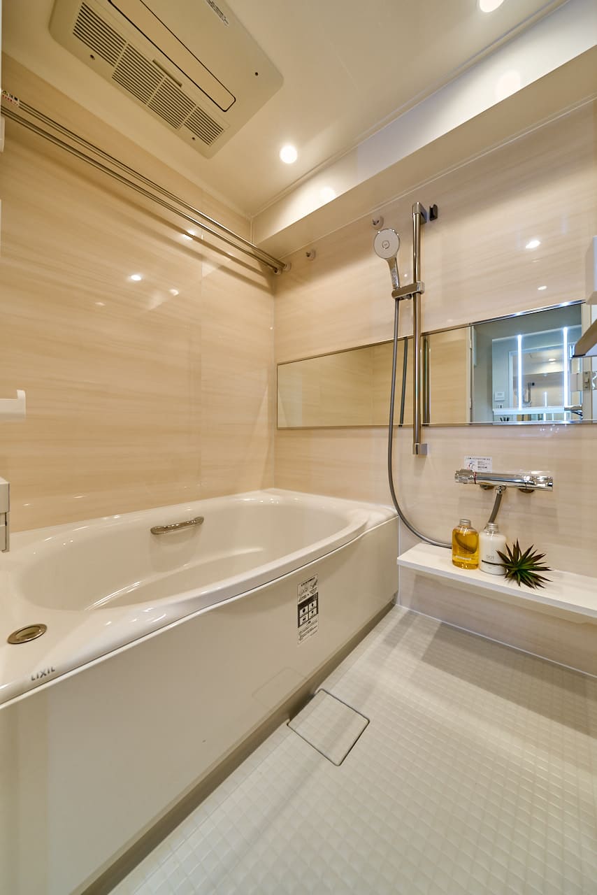 柔らかな印象を纏っているバスルームです。お風呂にゆっくり浸かるのが好きという方に嬉しい追い焚き機能を搭載。家族の入浴時間がずれてしまっても安心です。また、浴室乾燥機には暖房・乾燥・換気・涼風の機能がついており、一年中快適に過ごすことができます。
