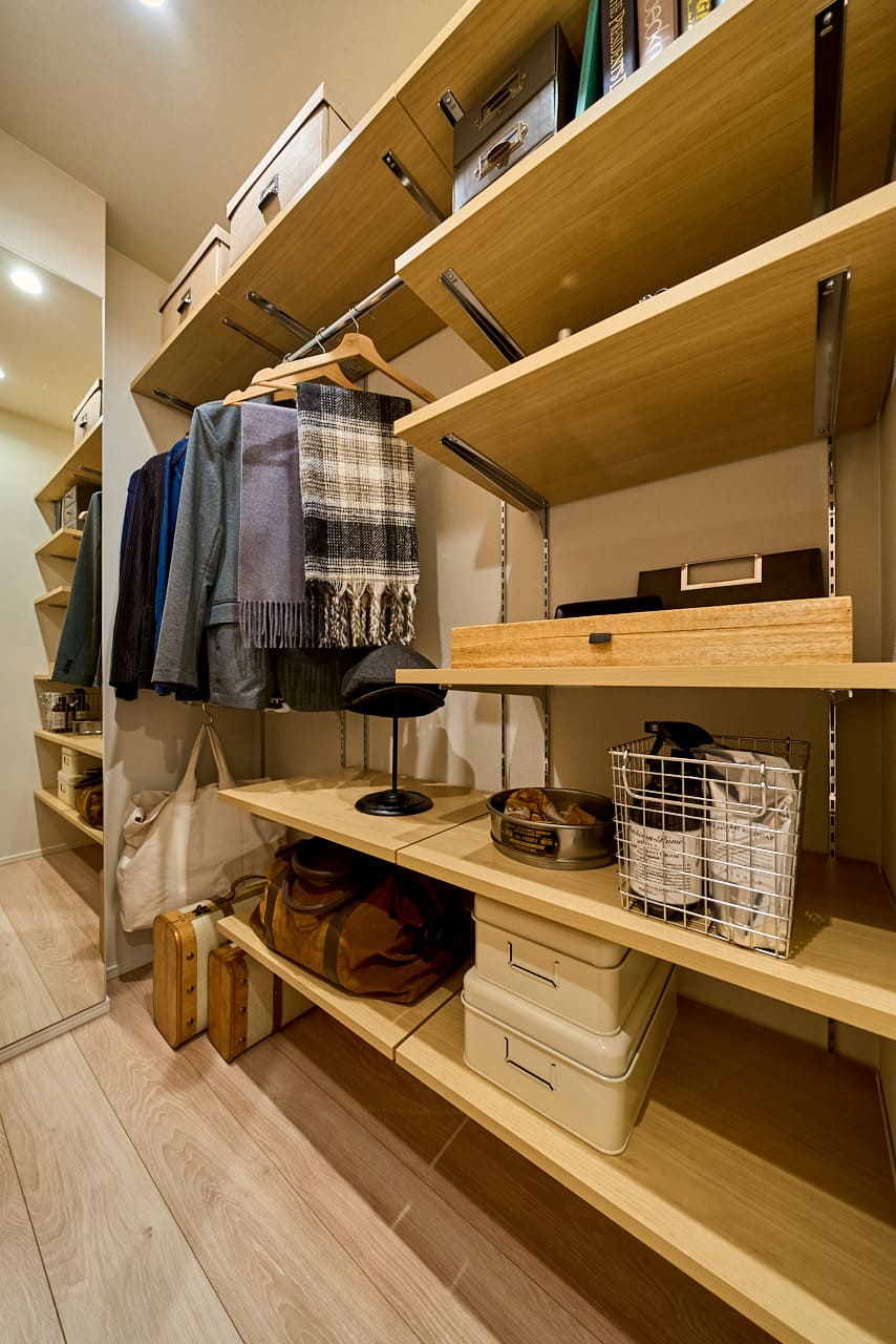 廊下にはウォークインクローゼットが造られています。中には可動棚や鏡が設置されているので、着替えやストック類の収納などに使えます。荷物をきちんと収納できると、居住スペースをより有効的に使うことができるので嬉しいですね。