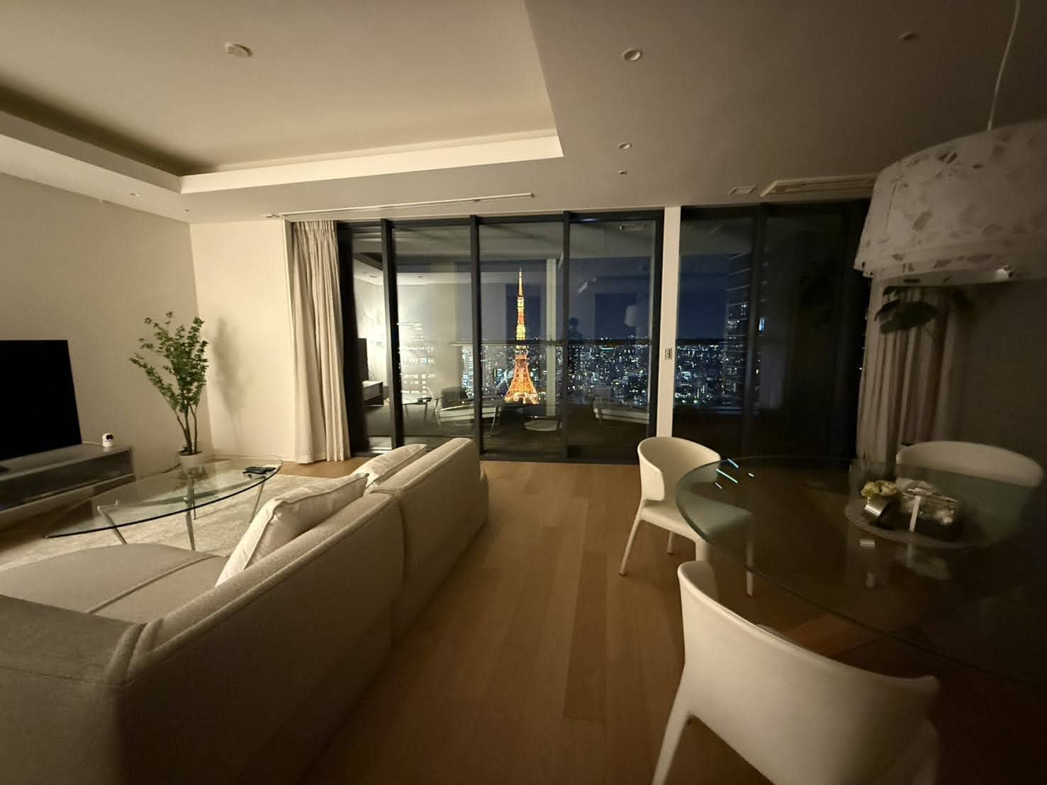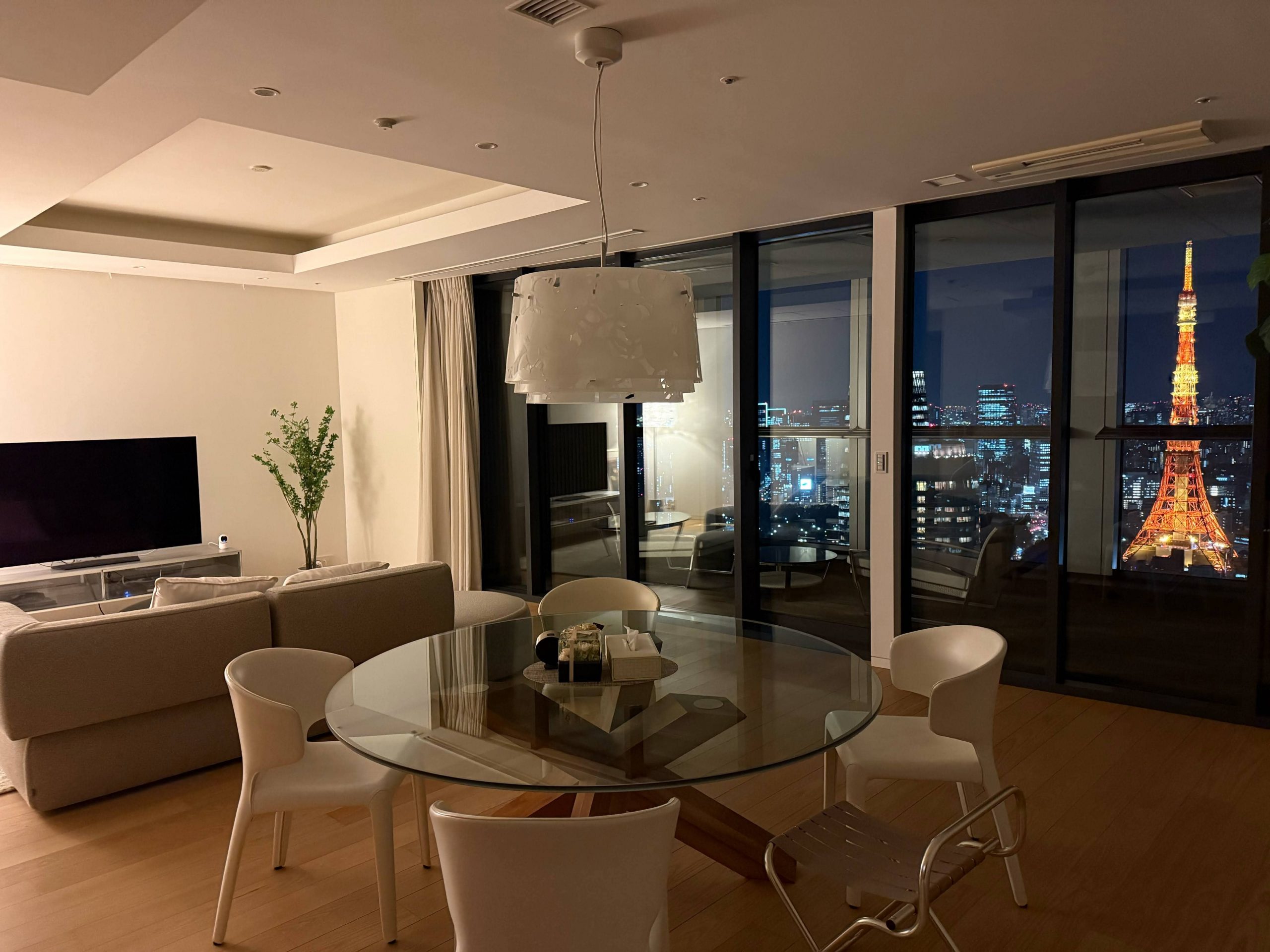 約26.0帖の広々としたリビングダイニングです。窓一面に広がるのは、都会の喧騒を忘れさせるほどのダイナミックな東京タワーの借景です。「夜景がきれい」という言葉だけでは収まりきらない、東京のランドマークを自室のインテリアの一部として迎え入れるという、唯一無二の付加価値があります。