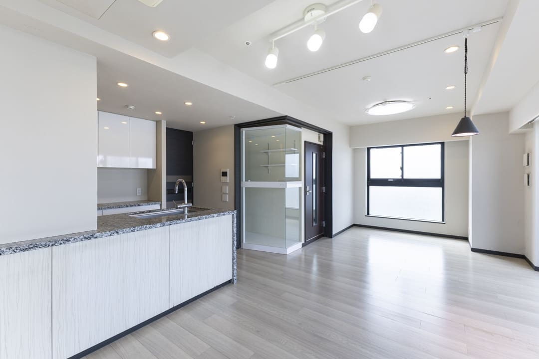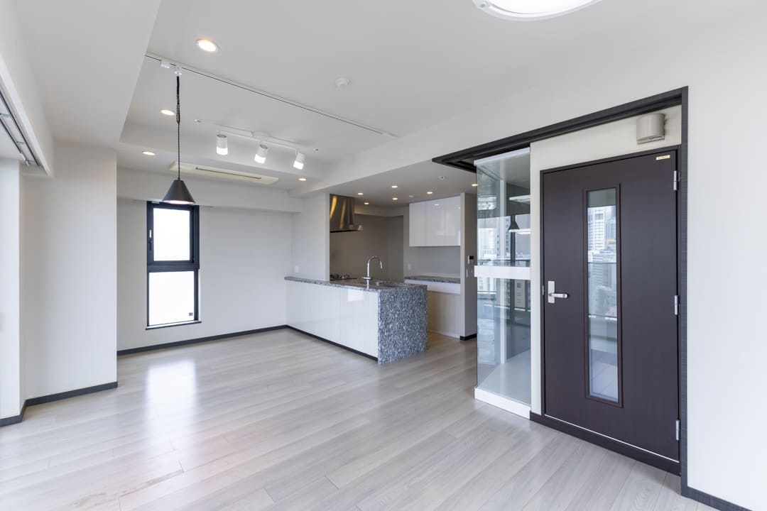 約14.4帖のリビングダイニング。三面採光で明るく、心地よい風が通り抜ける開放的な空間です。大きな窓がバルコニーへとつながり、内と外がゆるやかに連続するような伸びやかさも魅力。ビルトインエアコンが採用され、空間をすっきりとした印象に保ちます。現況でのお引き渡しのため、ご自身のライフスタイルに合わせたリフォームもご検討いただけます。